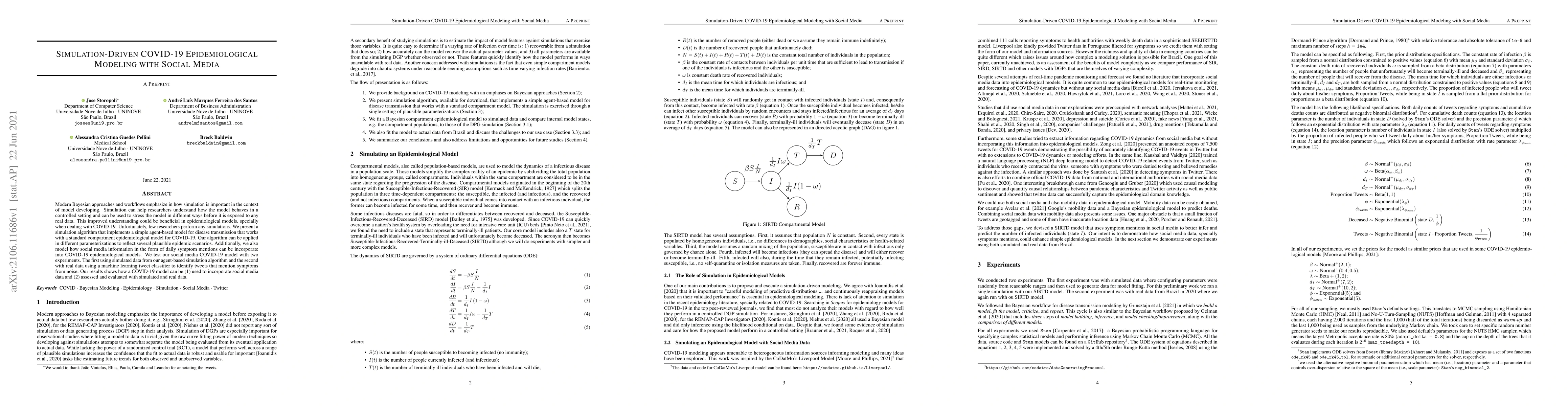 Modern Bayesian approaches and workflows emphasize in how simulation is important in the context of model developing. Simulation can help researchers understand how the model behaves in a controlled setting and can be used to stress the model in different ways before it is exposed to any real data. This improved understanding could be beneficial in epidemiological models, specially when dealing with COVID-19. Unfortunately, few researchers perform any simulations. We present a simulation algorithm that implements a simple agent-based model for disease transmission that works with a standard compartment epidemiological model for COVID-19. Our algorithm can be applied in different parameterizations to reflect several plausible epidemic scenarios. Additionally, we also model how social media information in the form of daily symptom mentions can be incorporate into COVID-19 epidemiological models. We test our social media COVID-19 model with two experiments. The first using simulated data from our agent-based simulation algorithm and the second with real data using a machine learning tweet classifier to identify tweets that mention symptoms from noise. Our results shows how a COVID-19 model can be (1) used to incorporate social media data and (2) assessed and evaluated with simulated and real data.