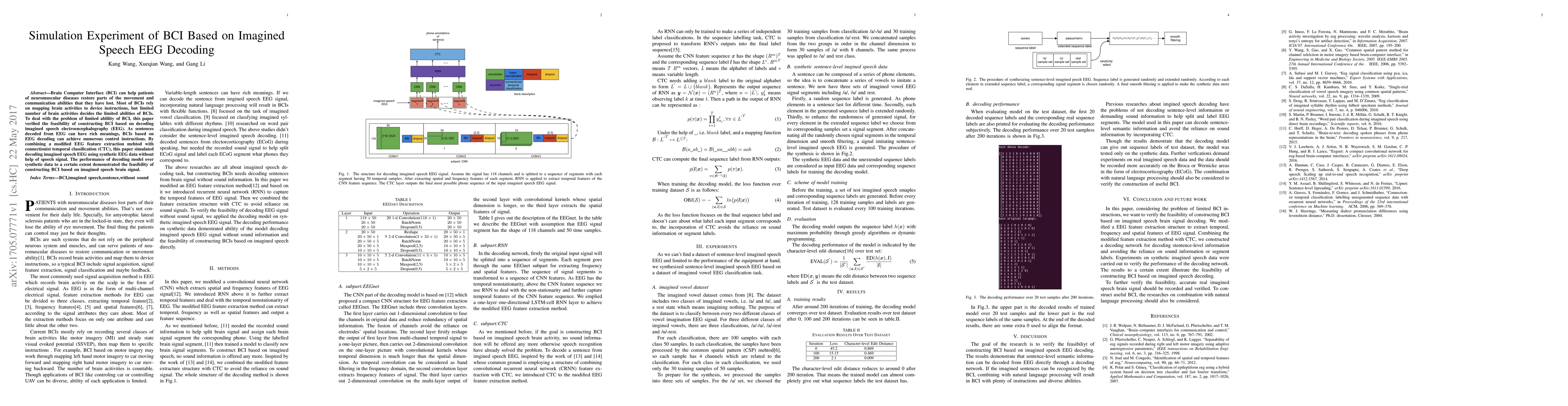 This paper explores the feasibility of constructing a Brain Computer Interface (BCI) based on decoding imagined speech from EEG signals, aiming to overcome the limitations of current BCIs. The study combines a modified EEG feature extraction method with connectionist temporal classification (CTC) to simulate decoding imagined speech using synthetic EEG data, demonstrating the potential for BCI systems to provide numerous control instructions.