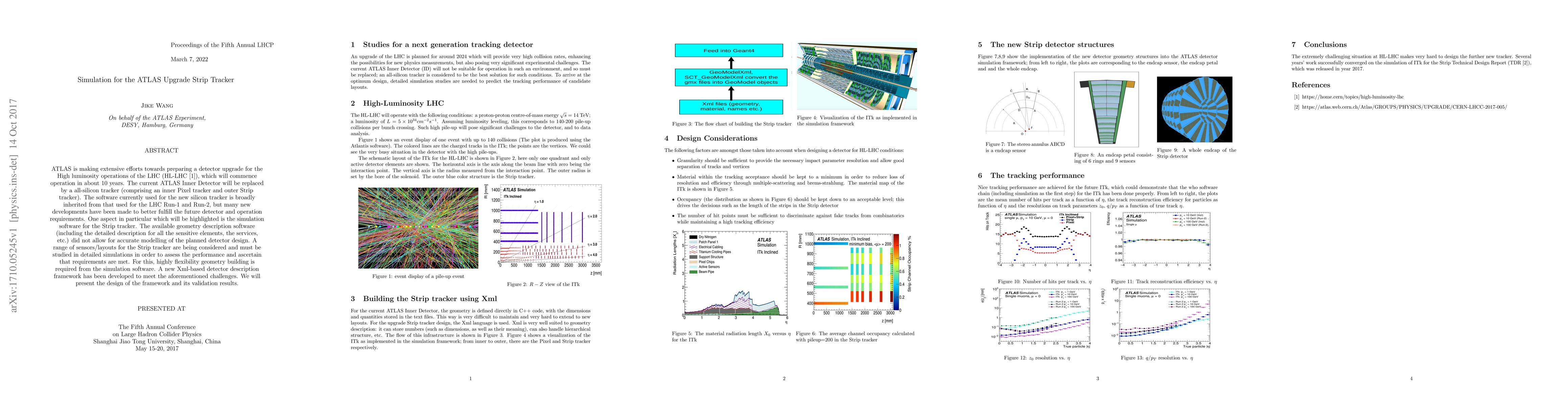 The ATLAS Upgrade Strip Tracker paper discusses the development of a new Xml-based detector description framework to simulate the Strip tracker for the ATLAS detector upgrade, aiming for high luminosity LHC operations. The new framework provides the flexibility needed to model various sensor layouts and validate performance against future requirements.