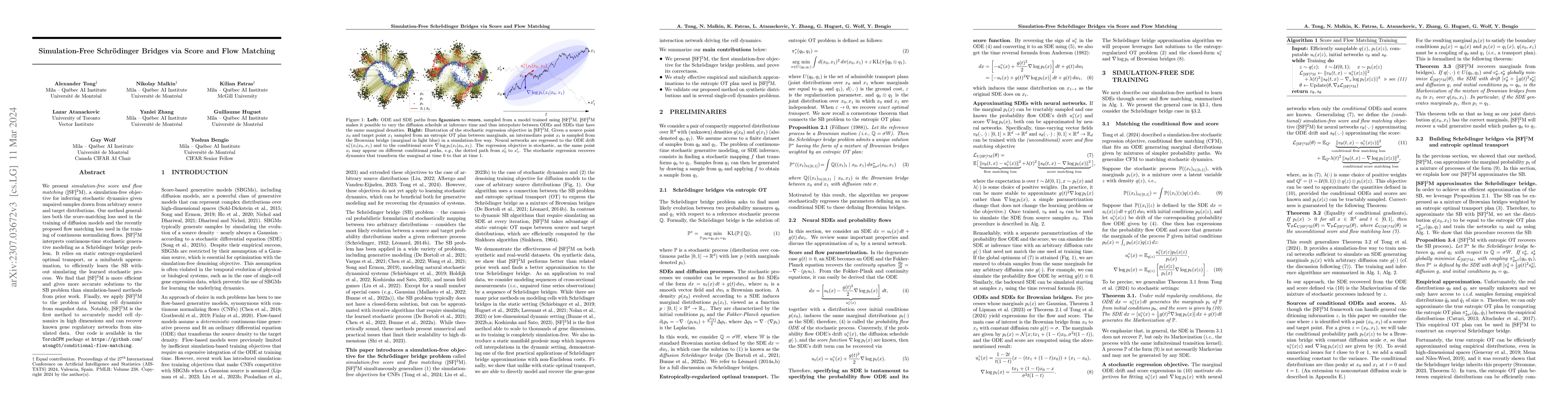We present simulation-free score and flow matching ([SF]$^2$M), a simulation-free objective for inferring stochastic dynamics given unpaired samples drawn from arbitrary source and target distributions. Our method generalizes both the score-matching loss used in the training of diffusion models and the recently proposed flow matching loss used in the training of continuous normalizing flows. [SF]$^2$M interprets continuous-time stochastic generative modeling as a Schr\"odinger bridge problem. It relies on static entropy-regularized optimal transport, or a minibatch approximation, to efficiently learn the SB without simulating the learned stochastic process. We find that [SF]$^2$M is more efficient and gives more accurate solutions to the SB problem than simulation-based methods from prior work. Finally, we apply [SF]$^2$M to the problem of learning cell dynamics from snapshot data. Notably, [SF]$^2$M is the first method to accurately model cell dynamics in high dimensions and can recover known gene regulatory networks from simulated data. Our code is available in the TorchCFM package at https://github.com/atong01/conditional-flow-matching.