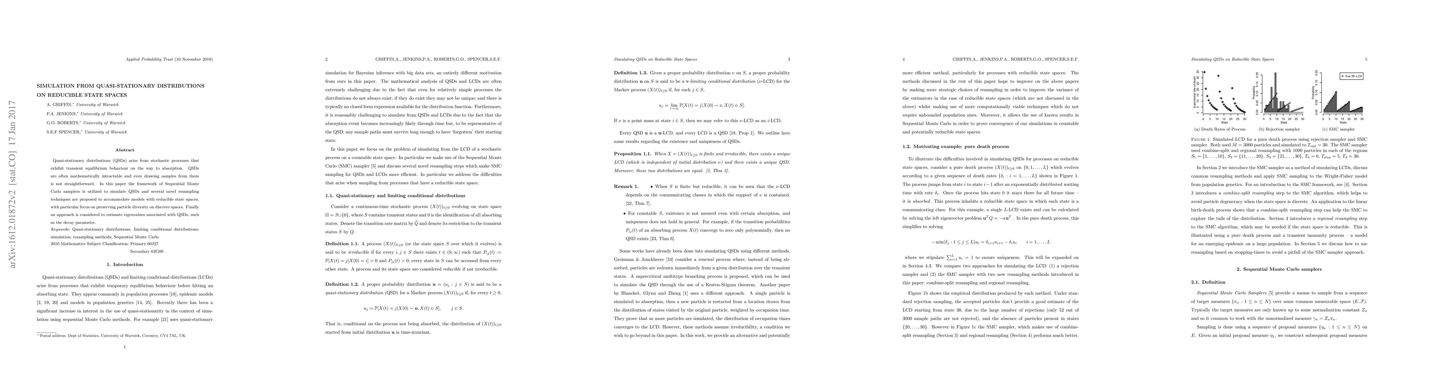 Quasi-stationary distributions (QSDs)arise from stochastic processes that exhibit transient equilibrium behaviour on the way to absorption QSDs are often mathematically intractable and even drawing samples from them is not straightforward. In this paper the framework of Sequential Monte Carlo samplers is utilized to simulate QSDs and several novel resampling techniques are proposed to accommodate models with reducible state spaces, with particular focus on preserving particle diversity on discrete spaces. Finally an approach is considered to estimate eigenvalues associated with QSDs, such as the decay parameter.