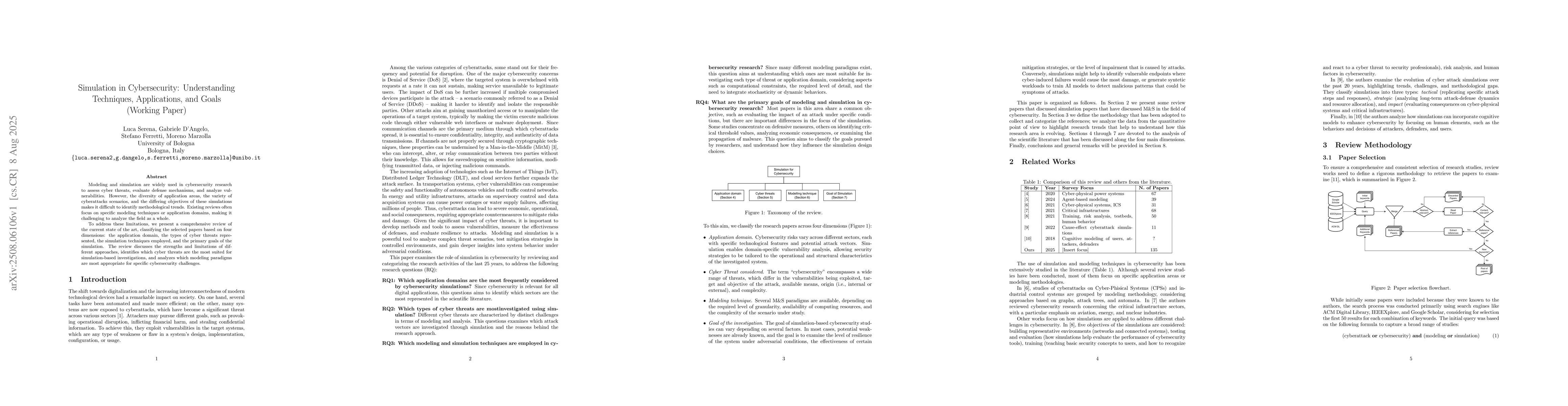 Modeling and simulation are widely used in cybersecurity research to assess cyber threats, evaluate defense mechanisms, and analyze vulnerabilities. However, the diversity of application areas, the variety of cyberattacks scenarios, and the differing objectives of these simulations makes it difficult to identify methodological trends. Existing reviews often focus on specific modeling techniques or application domains, making it challenging to analyze the field as a whole. To address these limitations, we present a comprehensive review of the current state of the art, classifying the selected papers based on four dimensions: the application domain, the types of cyber threats represented, the simulation techniques employed, and the primary goals of the simulation. The review discusses the strengths and limitations of different approaches, identifies which cyber threats are the most suited for simulation-based investigations, and analyzes which modeling paradigms are most appropriate for specific cybersecurity challenges.