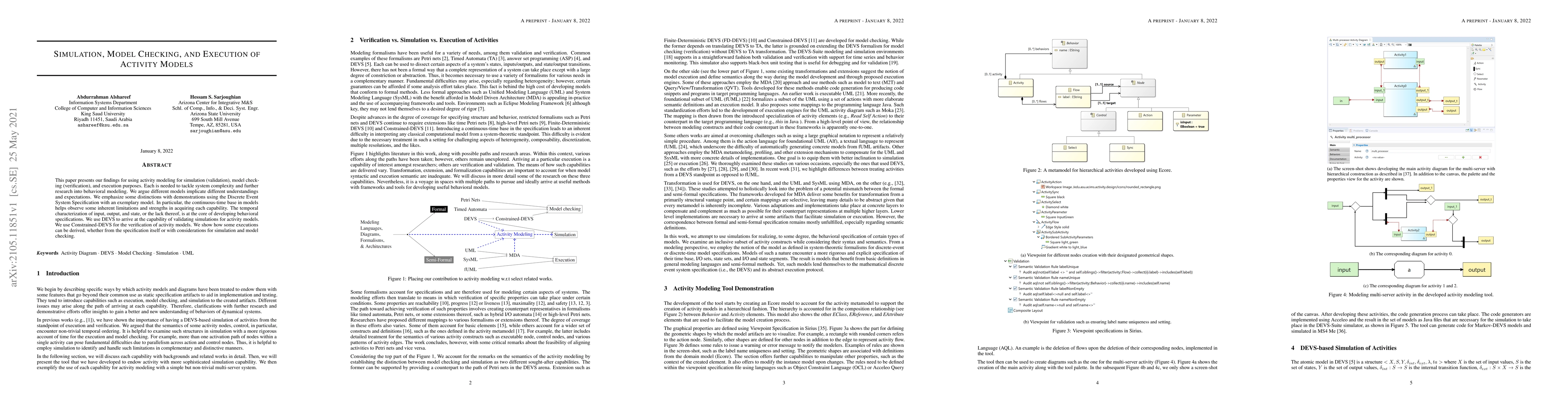 Researchers investigated the application of activity modeling for simulation, model checking, and execution, finding different models imply varying understandings and expectations. They demonstrated these capabilities using Discrete Event System Specification and Constrained-DEVS to validate simulations and verify activity models.