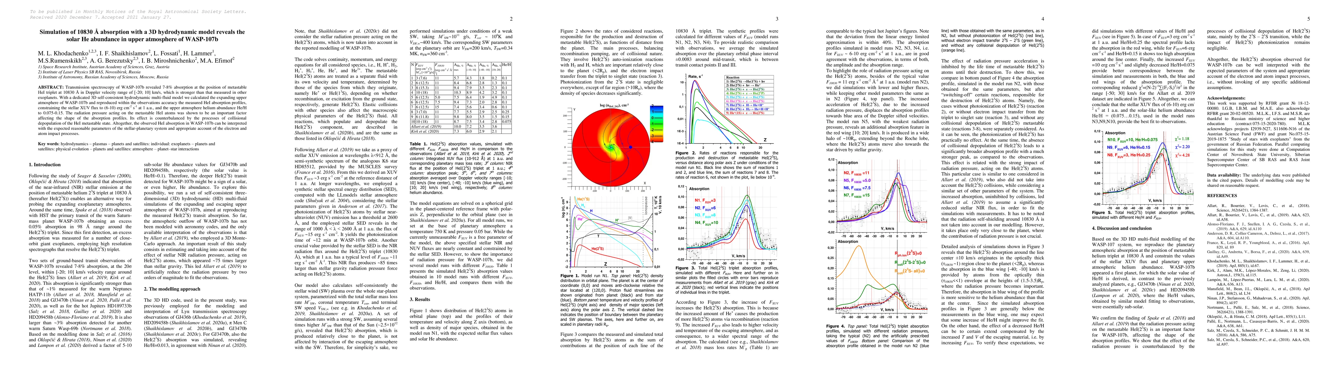 Researchers used a 3D hydrodynamic model to study the atmosphere of WASP-107b and found strong evidence for helium in its upper atmosphere, with an abundance of 0.075-0.15. The model also revealed the importance of radiation pressure on the absorption profiles.