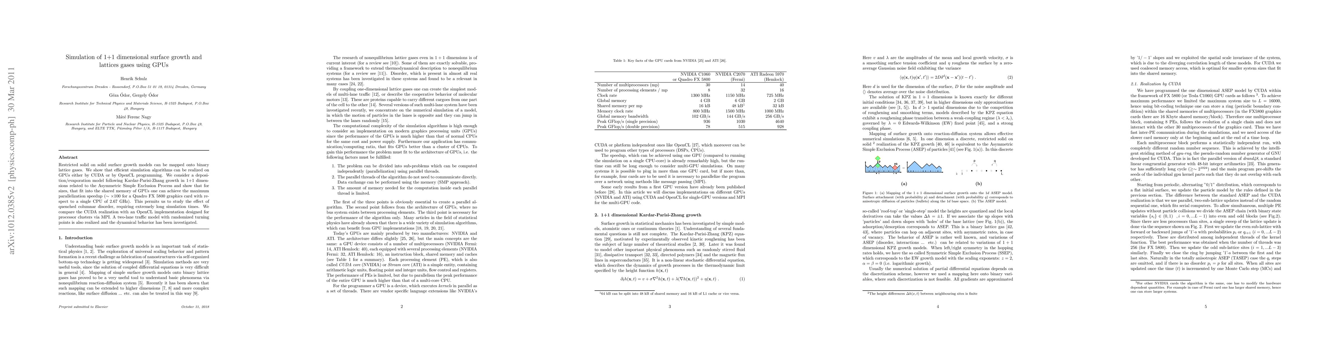 Restricted solid on solid surface growth models can be mapped onto binary lattice gases. We show that efficient simulation algorithms can be realized on GPUs either by CUDA or by OpenCL programming. We consider a deposition/evaporation model following Kardar-Parisi-Zhang growth in 1+1 dimensions related to the Asymmetric Simple Exclusion Process and show that for sizes, that fit into the shared memory of GPUs one can achieve the maximum parallelization speedup ~ x100 for a Quadro FX 5800 graphics card with respect to a single CPU of 2.67 GHz). This permits us to study the effect of quenched columnar disorder, requiring extremely long simulation times. We compare the CUDA realization with an OpenCL implementation designed for processor clusters via MPI. A two-lane traffic model with randomized turning points is also realized and the dynamical behavior has been investigated.