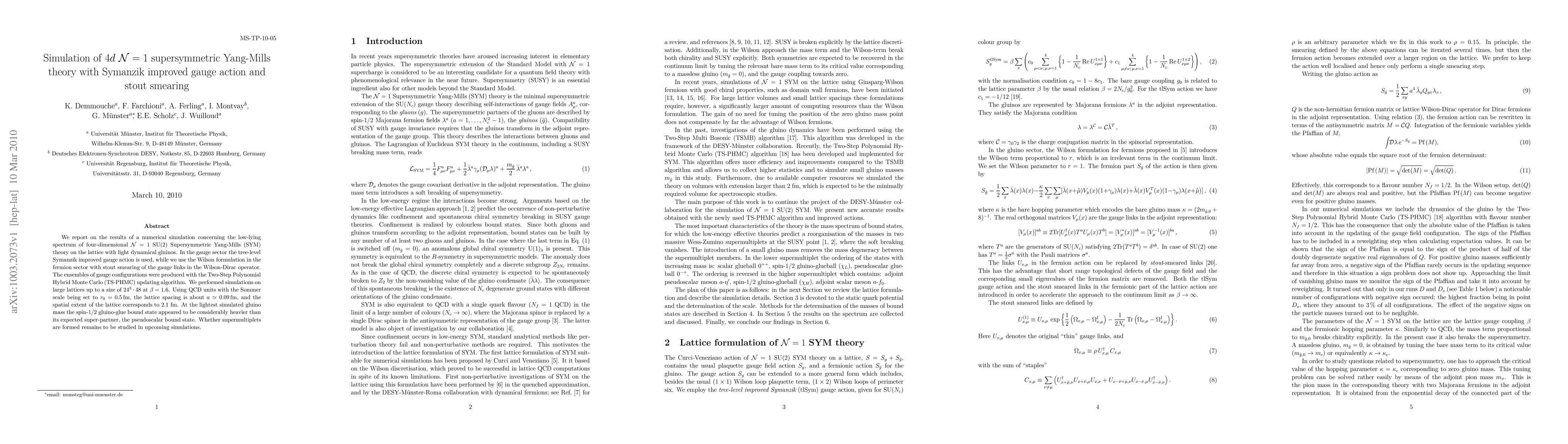 This paper reports on lattice simulations of 4d N=1 SU(2) Supersymmetric Yang-Mills theory using the Symanzik improved gauge action and stout smearing, revealing that the lightest gluino-glue bound state is heavier than its expected super-partner. Future simulations are needed to determine if supermultiplets form.