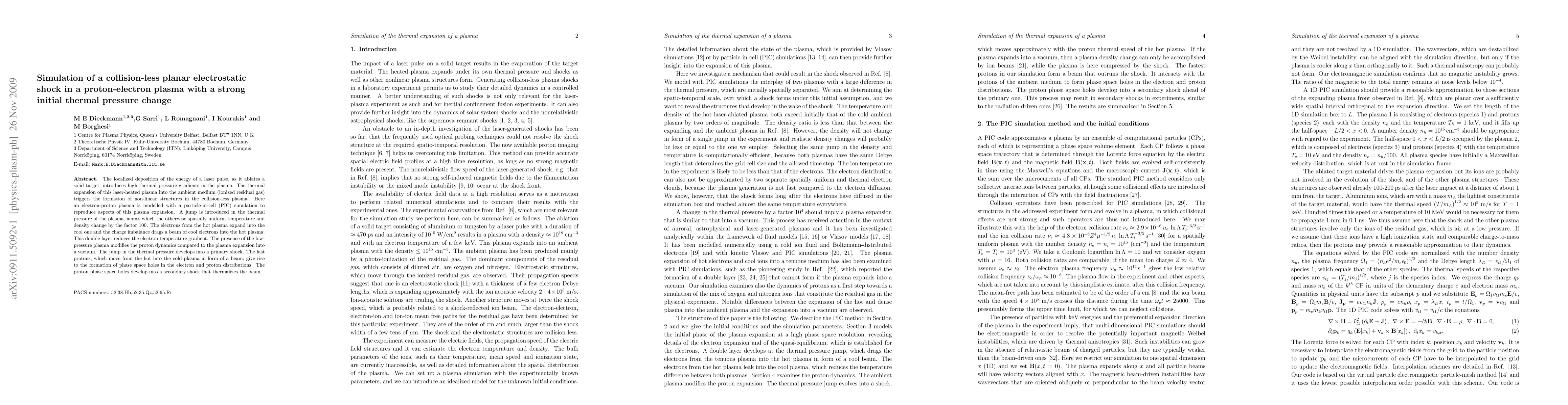This paper uses particle-in-cell simulations to model a collision-less planar electrostatic shock in a proton-electron plasma, focusing on the effects of a strong initial thermal pressure change. The simulation reveals the formation of a primary shock and a secondary shock that thermalizes a proton beam, influenced by the expansion of high-pressure plasma into a low-pressure medium.
