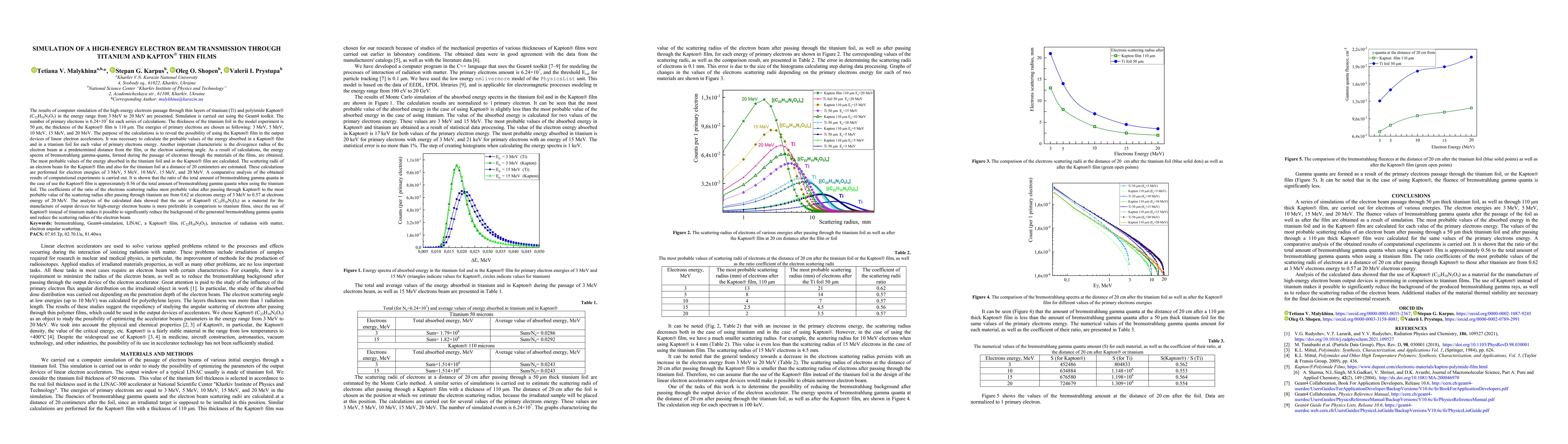 This study simulates high-energy electron beam transmission through titanium and Kapton$^\circledR$ thin films using the Geant4 toolkit, finding that Kapton$^\circledR$ significantly reduces bremsstrahlung gamma quanta and electron beam scattering compared to titanium, making it a preferable material for linear electron accelerator output devices.