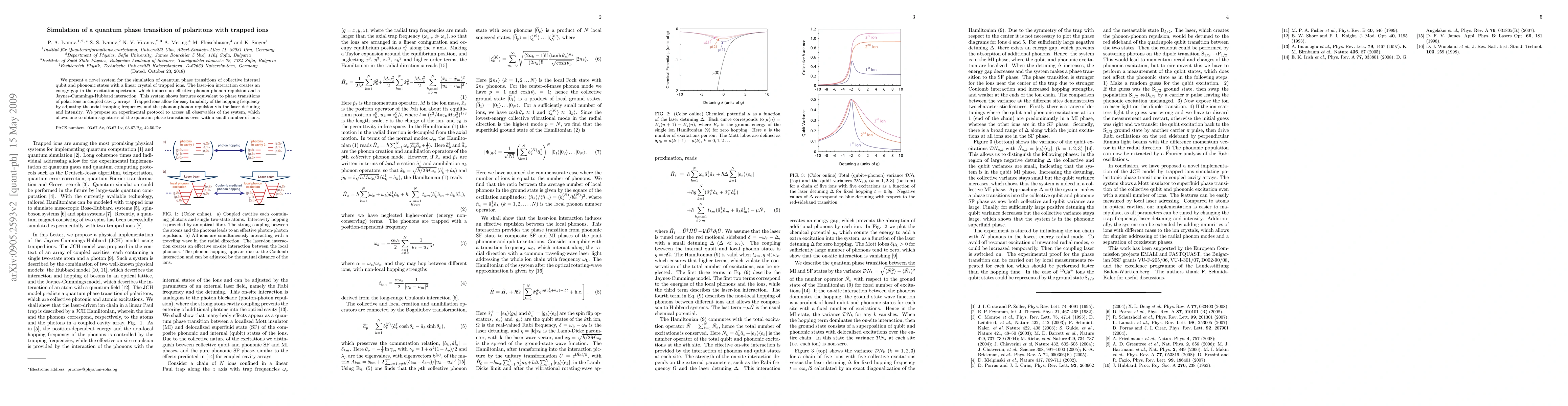 This paper proposes a novel system using trapped ions to simulate quantum phase transitions of polaritons, leveraging laser-ion interactions to create effective phonon-phonon repulsion and Jaynes-Cummings-Hubbard interactions. The system's tunability allows for observing quantum phase transition signatures with minimal ion count.