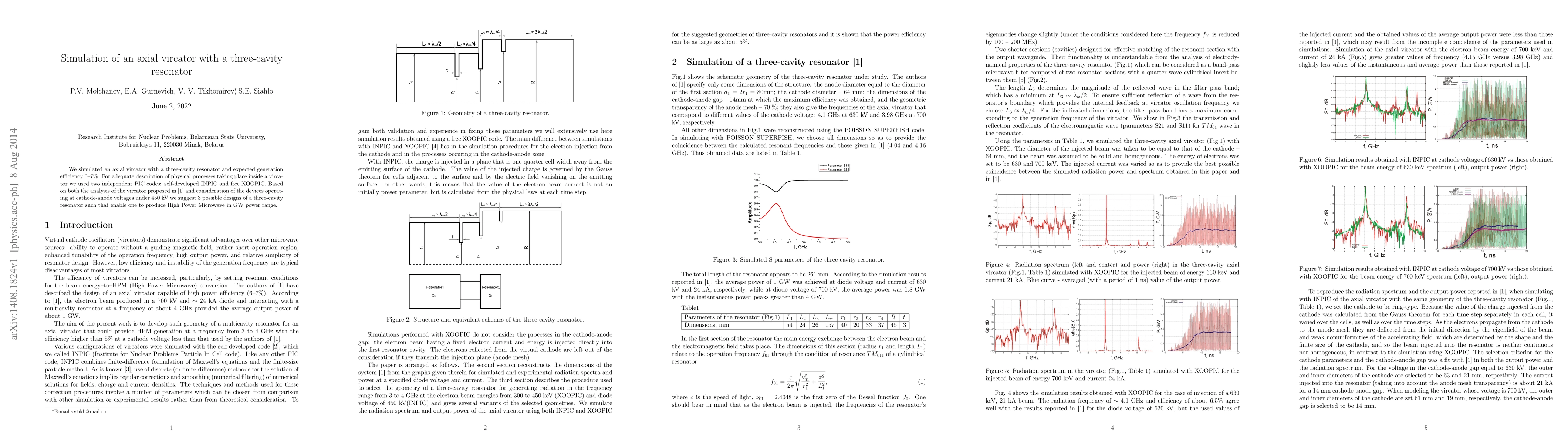 This paper simulates an axial vircator with a three-cavity resonator using two PIC codes to achieve expected generation efficiency of 6-7%. It proposes three designs for the resonator to generate High Power Microwave in the GW power range.
