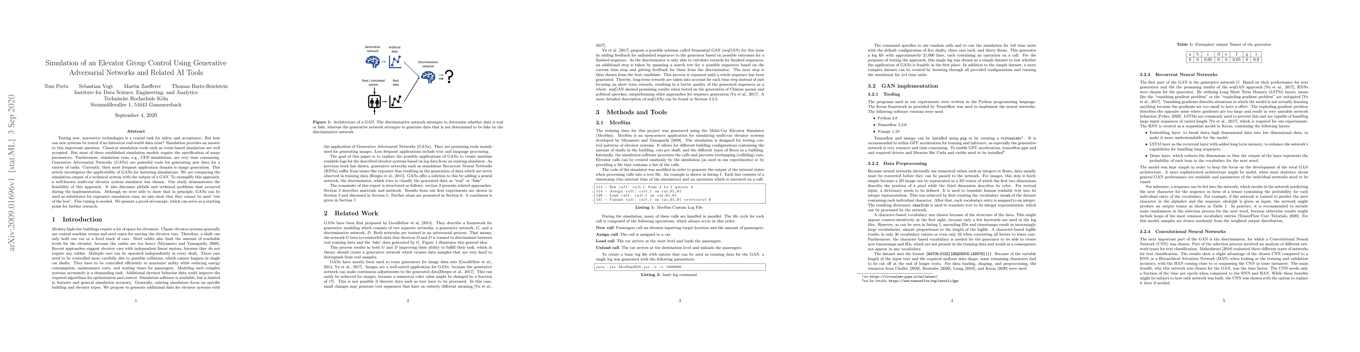 Testing new, innovative technologies is a crucial task for safety and acceptance. But how can new systems be tested if no historical real-world data exist? Simulation provides an answer to this important question. Classical simulation tools such as event-based simulation are well accepted. But most of these established simulation models require the specification of many parameters. Furthermore, simulation runs, e.g., CFD simulations, are very time consuming. Generative Adversarial Networks (GANs) are powerful tools for generating new data for a variety of tasks. Currently, their most frequent application domain is image generation. This article investigates the applicability of GANs for imitating simulations. We are comparing the simulation output of a technical system with the output of a GAN. To exemplify this approach, a well-known multi-car elevator system simulator was chosen. Our study demonstrates the feasibility of this approach. It also discusses pitfalls and technical problems that occurred during the implementation. Although we were able to show that in principle, GANs can be used as substitutes for expensive simulation runs, we also show that they cannot be used "out of the box". Fine tuning is needed. We present a proof-of-concept, which can serve as a starting point for further research.