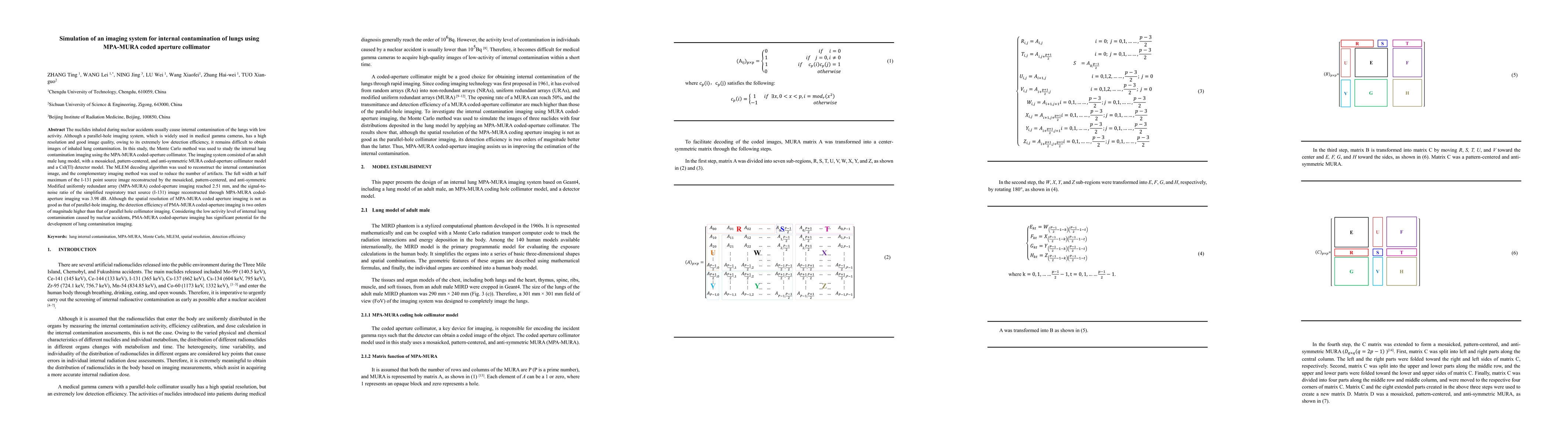 The nuclides inhaled during nuclear accidents usually cause internal contamination of the lungs with low activity. Although a parallel-hole imaging system, which is widely used in medical gamma cameras, has a high resolution and good image quality, owing to its extremely low detection efficiency, it remains difficult to obtain images of inhaled lung contamination. In this study, the Monte Carlo method was used to study the internal lung contamination imaging using the MPA-MURA coded-aperture collimator. The imaging system consisted of an adult male lung model, with a mosaicked, pattern-centered, and anti-symmetric MURA coded-aperture collimator model and a CsI(Tl) detector model. The MLEM decoding algorithm was used to reconstruct the internal contamination image, and the complementary imaging method was used to reduce the number of artifacts. The full width at half maximum of the I-131 point source image reconstructed by the mosaicked, pattern-centered, and anti-symmetric Modified uniformly redundant array (MPA-MURA) coded-aperture imaging reached 2.51 mm, and the signal-to-noise ratio of the simplified respiratory tract source (I-131) image reconstructed through MPA-MURA coded-aperture imaging was 3.98 dB. Although the spatial resolution of MPA-MURA coded aperture imaging is not as good as that of parallel-hole imaging, the detection efficiency of PMA-MURA coded-aperture imaging is two orders of magnitude higher than that of parallel hole collimator imaging. Considering the low activity level of internal lung contamination caused by nuclear accidents, PMA-MURA coded-aperture imaging has significant potential for the development of lung contamination imaging.