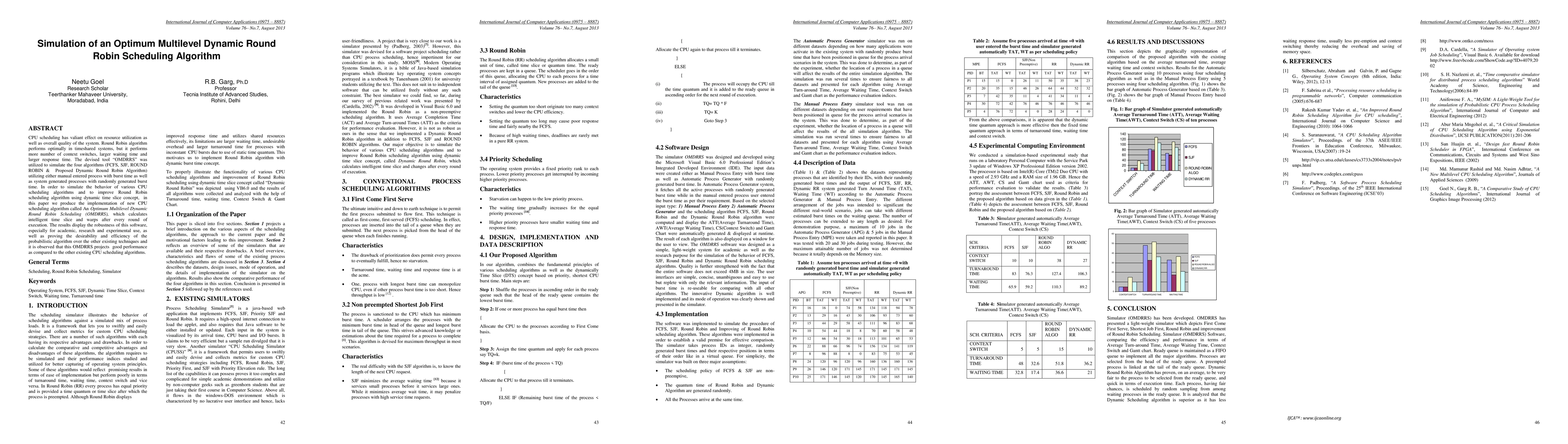 CPU scheduling has valiant effect on resource utilization as well as overall quality of the system. Round Robin algorithm performs optimally in time shared systems, but it performs more number of context switches, larger waiting time and larger response time. In order to simulate the behavior of various CPU scheduling algorithms and to improve Round Robin scheduling algorithm using dynamic time slice concept, in this paper we produce the implementation of new CPU scheduling algorithm called An Optimum Multilevel Dynamic Round Robin Scheduling (OMDRRS), which calculates intelligent time slice and warps after every round of execution. The results display the robustness of this software, especially for academic, research and experimental use, as well as proving the desirability and efficiency of the probabilistic algorithm over the other existing techniques and it is observed that this OMDRRS projects good performance as compared to the other existing CPU scheduling algorithms.