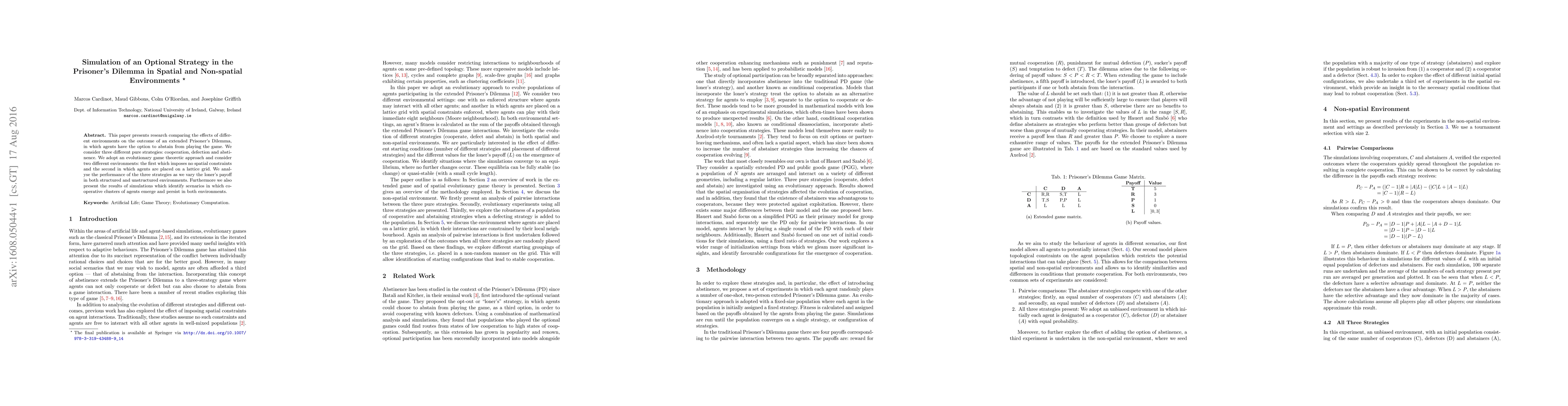 This paper presents research comparing the effects of different environments on the outcome of an extended Prisoner's Dilemma, in which agents have the option to abstain from playing the game. We consider three different pure strategies: cooperation, defection and abstinence. We adopt an evolutionary game theoretic approach and consider two different environments: the first which imposes no spatial constraints and the second in which agents are placed on a lattice grid. We analyse the performance of the three strategies as we vary the loner's payoff in both structured and unstructured environments. Furthermore we also present the results of simulations which identify scenarios in which cooperative clusters of agents emerge and persist in both environments.