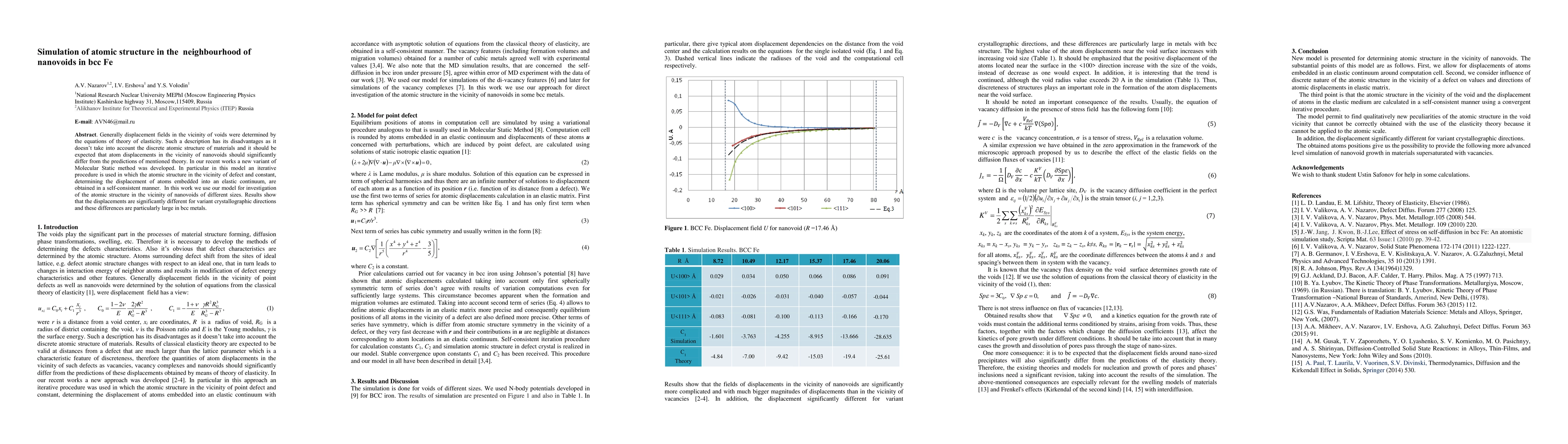 This paper explores atomic structure near nanovoids in bcc Fe using a new Molecular Static method, revealing significant differences in atomic displacements compared to predictions from elasticity theory, especially in bcc metals. The model iteratively determines atomic displacements and defect-related constants in a self-consistent manner.