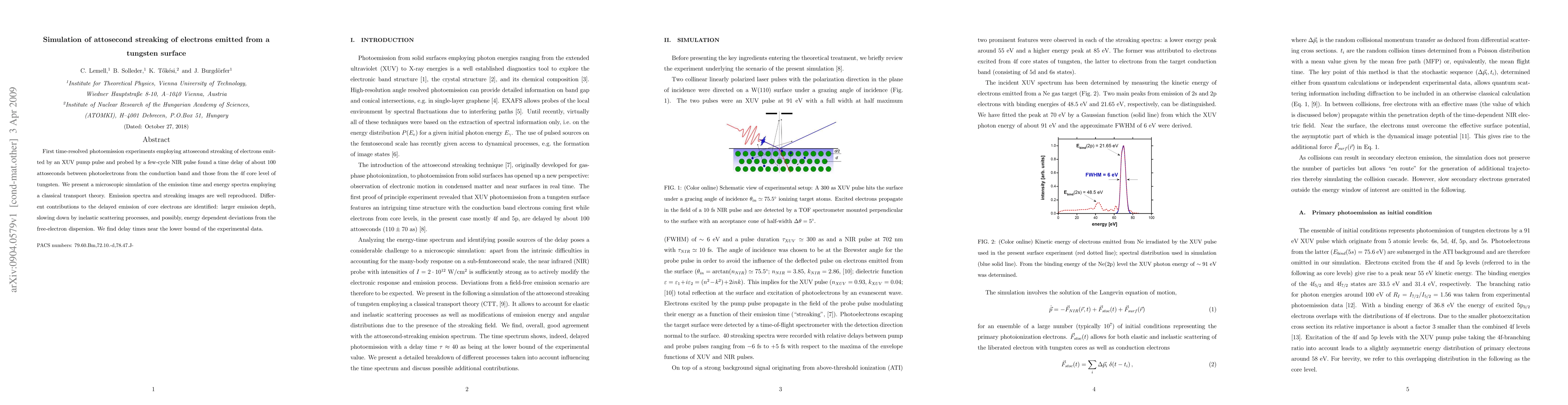 This paper reports a simulation of attosecond streaking of electrons emitted from tungsten under XUV and NIR pulses, revealing a 100 attosecond delay between conduction and core level electrons. The simulation, based on classical transport theory, accurately reproduces emission spectra and identifies factors contributing to the delay, including emission depth and scattering processes.