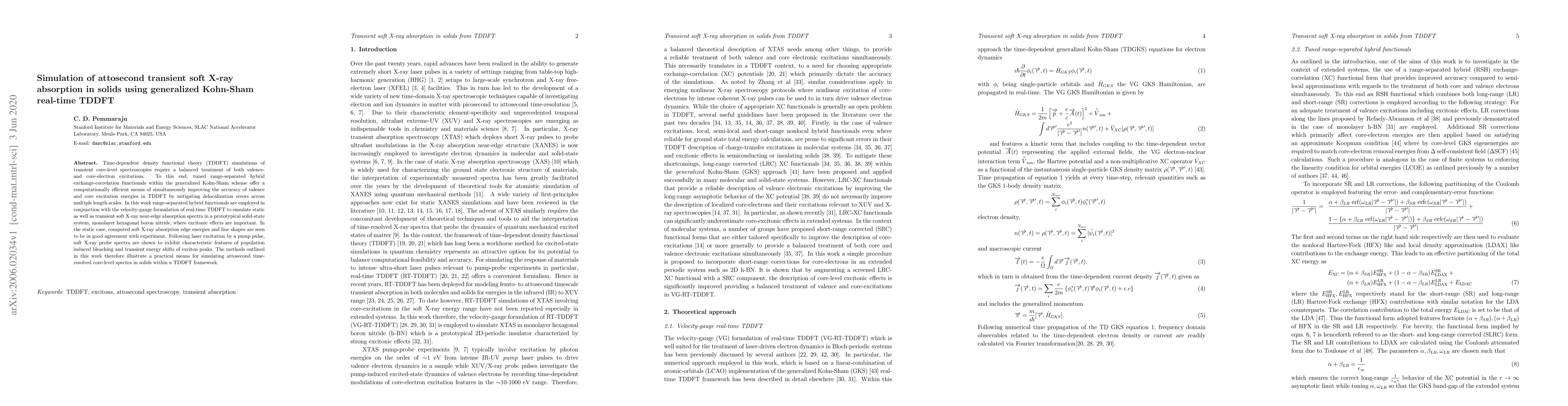 This paper employs generalized Kohn-Sham real-time TDDFT with range-separated hybrid functionals to simulate transient soft X-ray absorption in solids, demonstrating accurate static and dynamic spectra in hexagonal boron nitride, including excitonic effects and attosecond time-resolved features.