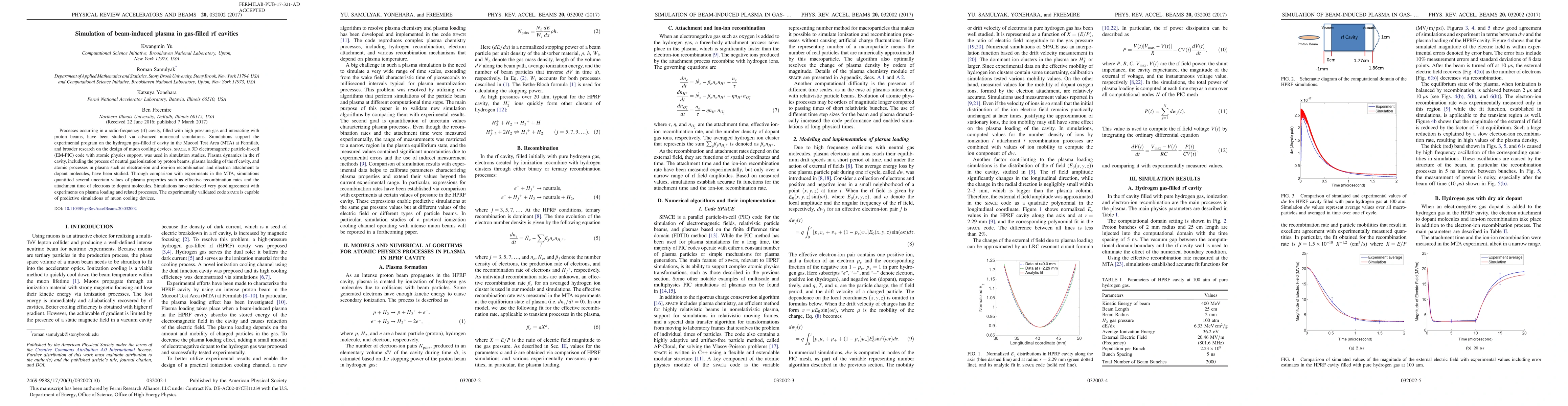 Processes occurring in a radio-frequency (rf) cavity, filled with high pressure gas and interacting with proton beams, have been studied via advanced numerical simulations. Simulations support the experimental program on the hydrogen gas-filled rf cavity in the Mucool Test Area (MTA) at Fermilab, and broader research on the design of muon cooling devices. SPACE, a 3D electromagnetic particle-in-cell (EM-PIC) code with atomic physics support, was used in simulation studies. Plasma dynamics in the rf cavity, including the process of neutral gas ionization by proton beams, plasma loading of the rf cavity, and atomic processes in plasma such as electron-ion and ion-ion recombination and electron attachment to dopant molecules, have been studied. Through comparison with experiments in the MTA, simulations quantified several uncertain values of plasma properties such as effective recombination rates and the attachment time of electrons to dopant molecules. Simulations have achieved very good agreement with experiments on plasma loading and related processes. The experimentally validated code SPACE is capable of predictive simulations of muon cooling devices.