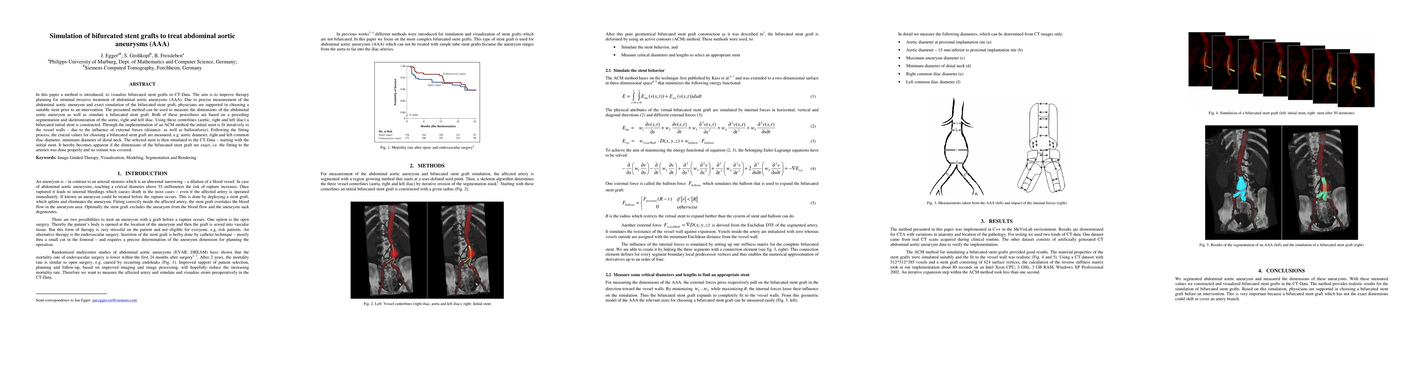 In this paper a method is introduced, to visualize bifurcated stent grafts in CT-Data. The aim is to improve therapy planning for minimal invasive treatment of abdominal aortic aneurysms (AAA). Due to precise measurement of the abdominal aortic aneurysm and exact simulation of the bifurcated stent graft, physicians are supported in choosing a suitable stent prior to an intervention. The presented method can be used to measure the dimensions of the abdominal aortic aneurysm as well as simulate a bifurcated stent graft. Both of these procedures are based on a preceding segmentation and skeletonization of the aortic, right and left iliac. Using these centerlines (aortic, right and left iliac) a bifurcated initial stent is constructed. Through the implementation of an ACM method the initial stent is fit iteratively to the vessel walls - due to the influence of external forces (distance- as well as balloonforce). Following the fitting process, the crucial values for choosing a bifurcated stent graft are measured, e.g. aortic diameter, right and left common iliac diameter, minimum diameter of distal neck. The selected stent is then simulated to the CT-Data - starting with the initial stent. It hereby becomes apparent if the dimensions of the bifurcated stent graft are exact, i.e. the fitting to the arteries was done properly and no ostium was covered.