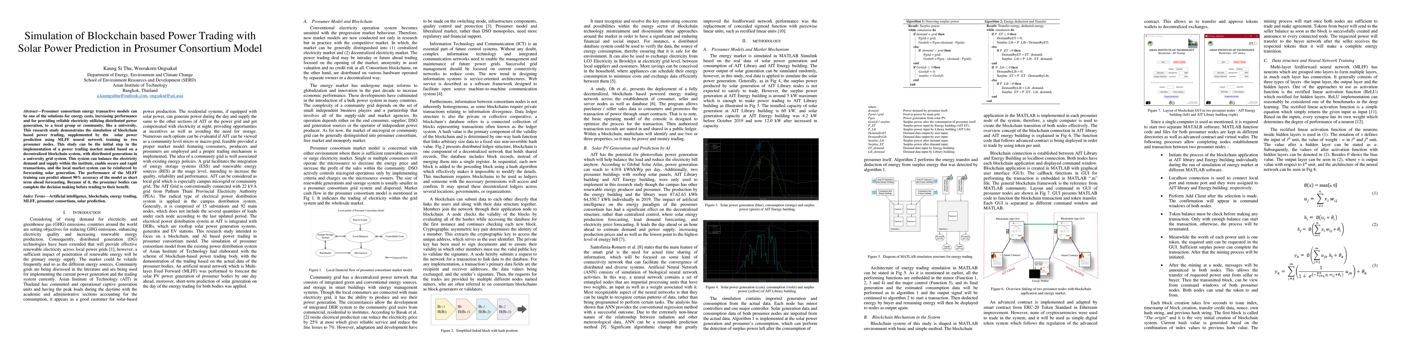 This paper simulates blockchain-based power trading in a prosumer consortium model, utilizing solar power predictions via MLFF neural networks. The study aims to balance electricity demand and supply within a university grid, enabling secure transactions and forecasting solar generation with nearly 90% accuracy.