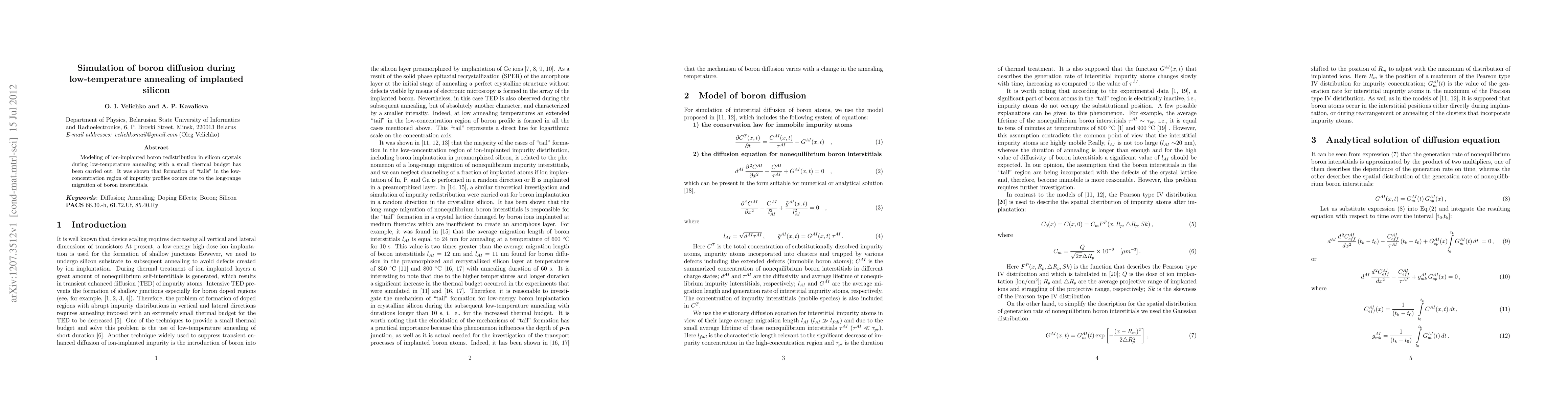 Two-line summary: This study models boron diffusion in silicon during low-temperature annealing, revealing the formation of "tails" in impurity profiles due to the long-range migration of boron interstitials. The simulation highlights the impact of minimal thermal budgets on boron redistribution.