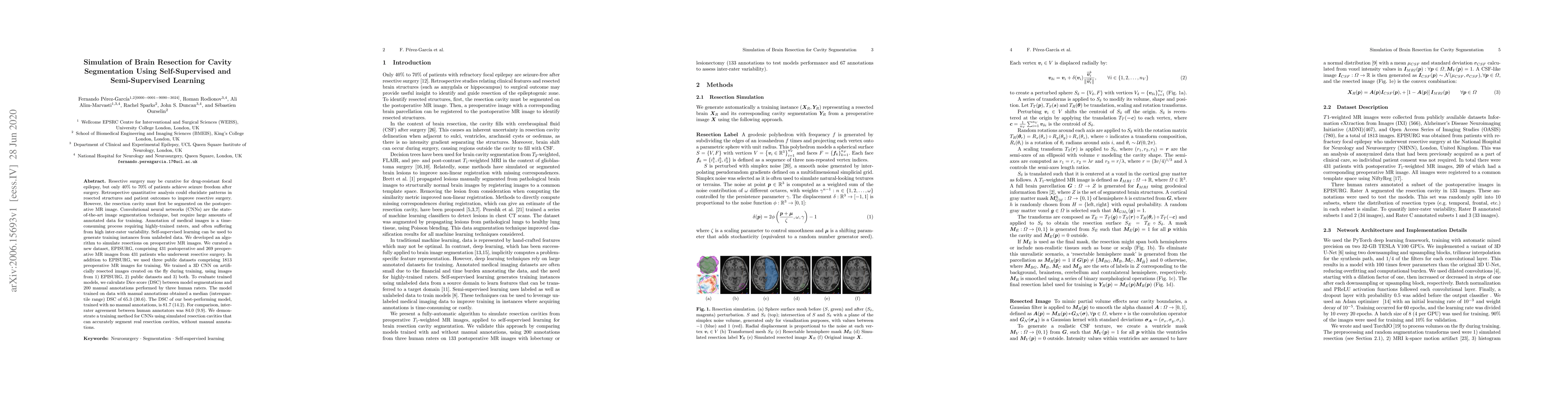 Resective surgery may be curative for drug-resistant focal epilepsy, but only 40% to 70% of patients achieve seizure freedom after surgery. Retrospective quantitative analysis could elucidate patterns in resected structures and patient outcomes to improve resective surgery. However, the resection cavity must first be segmented on the postoperative MR image. Convolutional neural networks (CNNs) are the state-of-the-art image segmentation technique, but require large amounts of annotated data for training. Annotation of medical images is a time-consuming process requiring highly-trained raters, and often suffering from high inter-rater variability. Self-supervised learning can be used to generate training instances from unlabeled data. We developed an algorithm to simulate resections on preoperative MR images. We curated a new dataset, EPISURG, comprising 431 postoperative and 269 preoperative MR images from 431 patients who underwent resective surgery. In addition to EPISURG, we used three public datasets comprising 1813 preoperative MR images for training. We trained a 3D CNN on artificially resected images created on the fly during training, using images from 1) EPISURG, 2) public datasets and 3) both. To evaluate trained models, we calculate Dice score (DSC) between model segmentations and 200 manual annotations performed by three human raters. The model trained on data with manual annotations obtained a median (interquartile range) DSC of 65.3 (30.6). The DSC of our best-performing model, trained with no manual annotations, is 81.7 (14.2). For comparison, inter-rater agreement between human annotators was 84.0 (9.9). We demonstrate a training method for CNNs using simulated resection cavities that can accurately segment real resection cavities, without manual annotations.