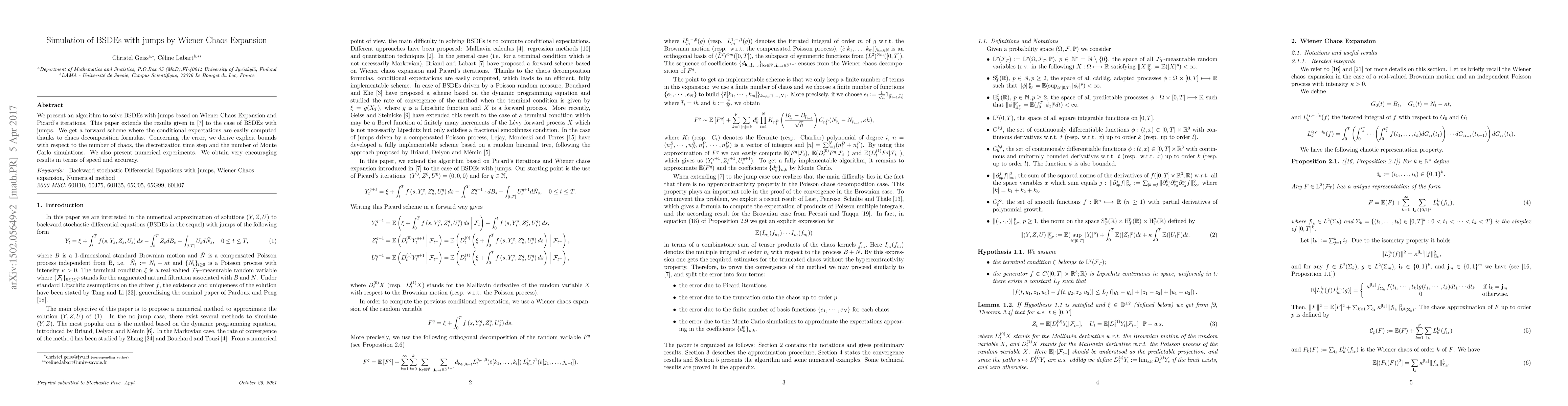This paper proposes an algorithm for solving BSDEs with jumps using Wiener Chaos Expansion and Picard's iterations, extending previous results to include jump processes. The method provides a forward scheme with easily computed conditional expectations and derives explicit error bounds, showing promising speed and accuracy in numerical experiments.