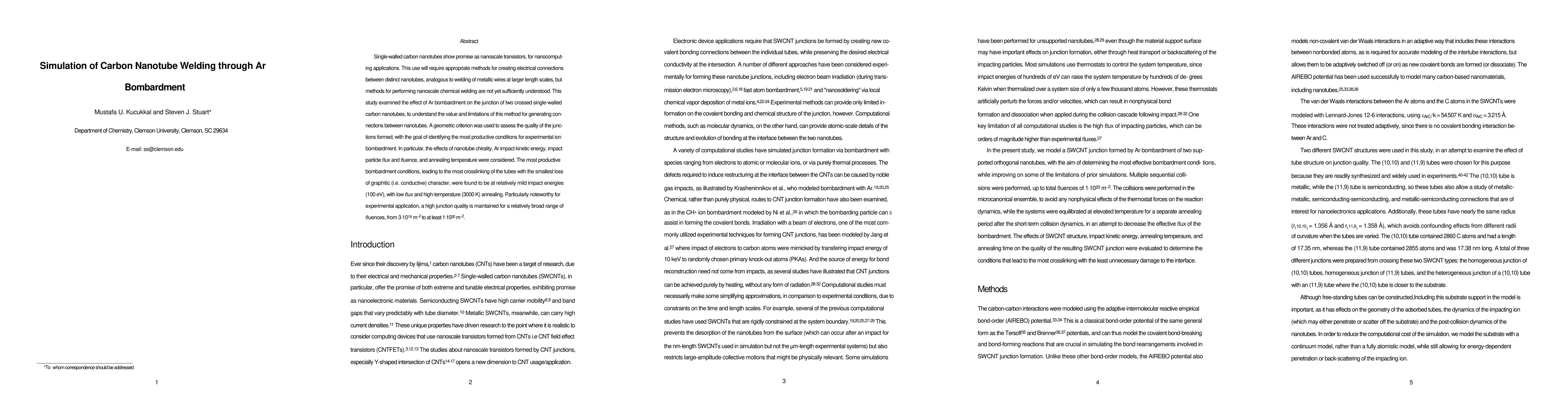 This study investigates the use of Ar bombardment to weld single-walled carbon nanotubes, finding that optimal conditions involve mild impact energies (100 eV) and high annealing temperatures (3000 K), which maintain high junction quality over a broad range of fluences.