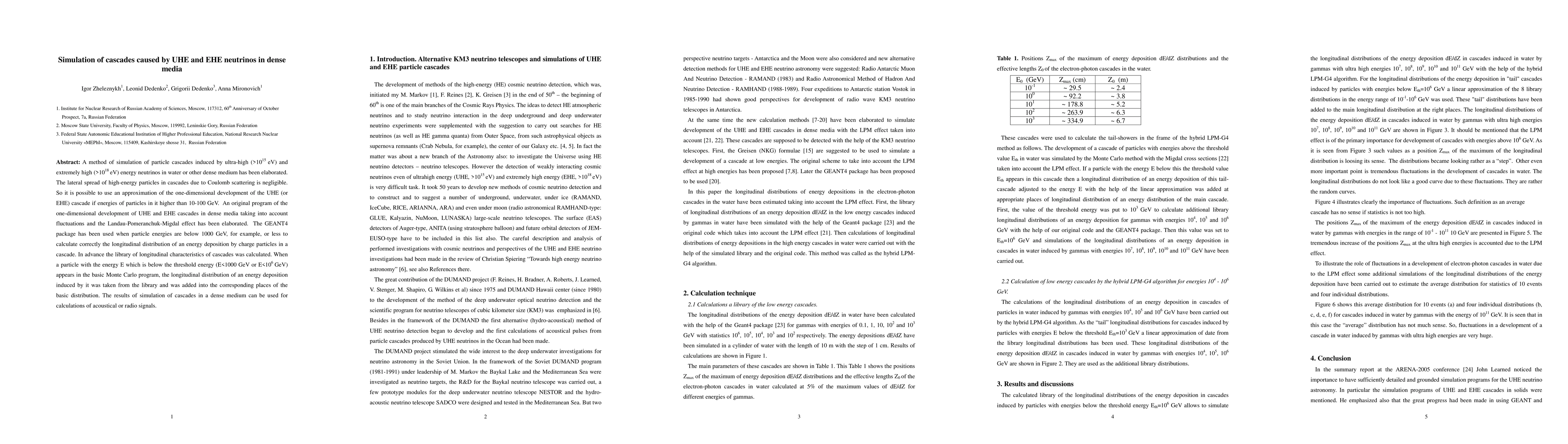 A method of simulation of particle cascades induced by ultra-high (>10$^{15}$ eV) and extremely high (>10$^{18}$ eV) energy neutrinos in water or other dense medium has been elaborated. The lateral spread of high-energy particles in cascades due to Coulomb scattering is negligible. So it is possible to use an approximation of the one-dimensional development of the UHE (or EHE) cascade if energies of particles in it higher than 10-100 GeV. An original program of the one-dimensional development of UHE and EHE cascades in dense media taking into account fluctuations and the Landau-Pomeranchuk-Migdal effect has been elaborated. The GEANT4 package has been used when particle energies are below 1000 GeV, for example, or less to calculate correctly the longitudinal distribution of an energy deposition by charge particles in a cascade. In advance the library of longitudinal characteristics of cascades was calculated. When a particle with the energy E which is below the threshold energy (E<1000 GeV or E<10$^6$ GeV) appears in the basic Monte Carlo program, the longitudinal distribution of an energy deposition induced by it was taken from the library and was added into the corresponding places of the basic distribution. The results of simulation of cascades in a dense medium can be used for calculations of acoustical or radio signals.