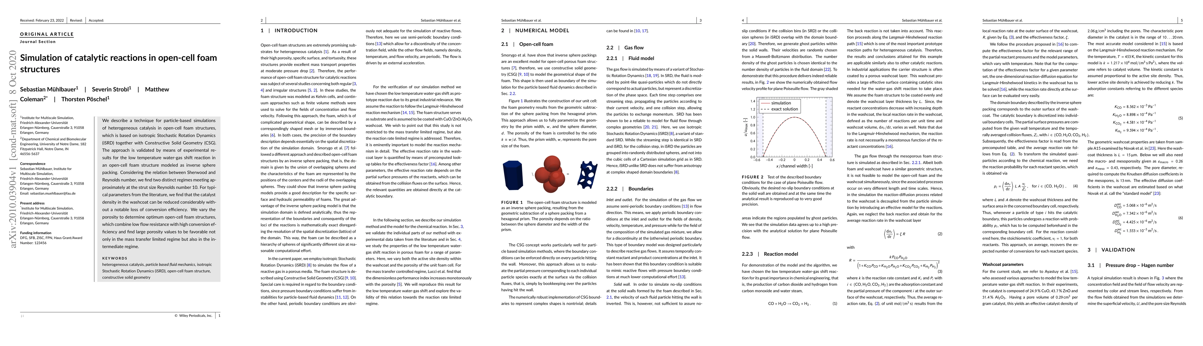 We describe a technique for particle-based simulations of heterogeneous catalysis in open-cell foam structures, which is based on isotropic Stochastic Rotation Dynamics (iSRD) together with Constructive Solid Geometry (CSG). The approach is validated by means of experimental results for the low temperature water-gas shift reaction in an open-cell foam structure modeled as inverse sphere packing. Considering the relation between Sherwood and Reynolds number, we find two distinct regimes meeting approximately at the strut size Reynolds number 10. For typical parameters from the literature, we find that the catalyst density in the washcoat can be reduced considerably without a notable loss of conversion efficiency. We vary the porosity to determine optimum open-cell foam structures, which combine low flow resistance with high conversion efficiency and find large porosity values to be favorable not only in the mass transfer limited regime but also in the intermediate regime.