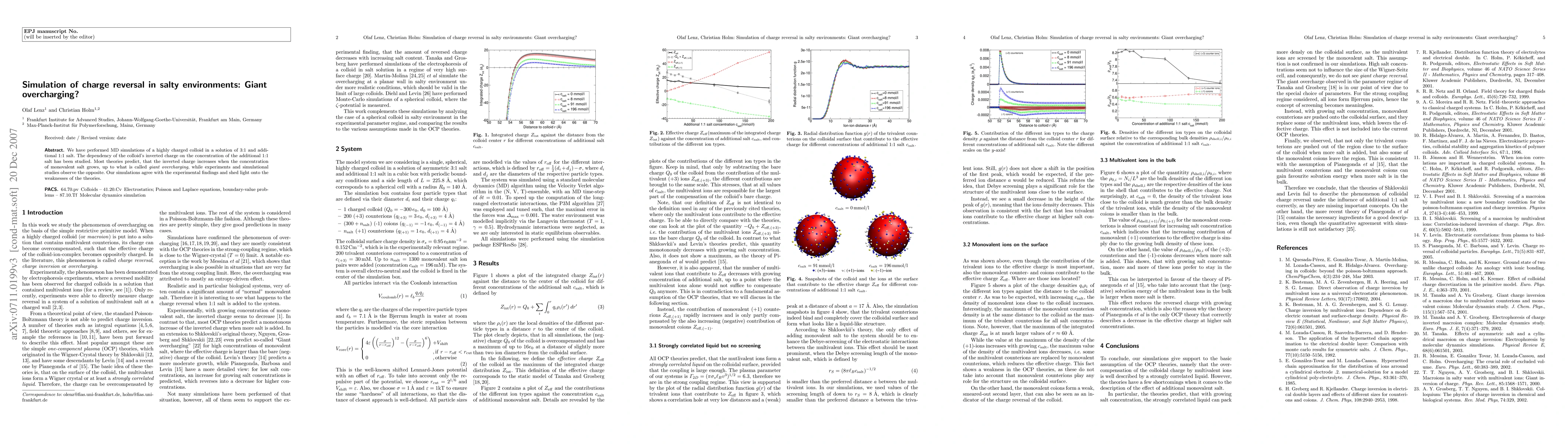 This paper uses MD simulations to study the charge reversal of a highly charged colloid in salty environments, finding that the inverted charge does not increase with monovalent salt concentration as predicted by most theories, aligning instead with experimental observations and highlighting theoretical shortcomings.
