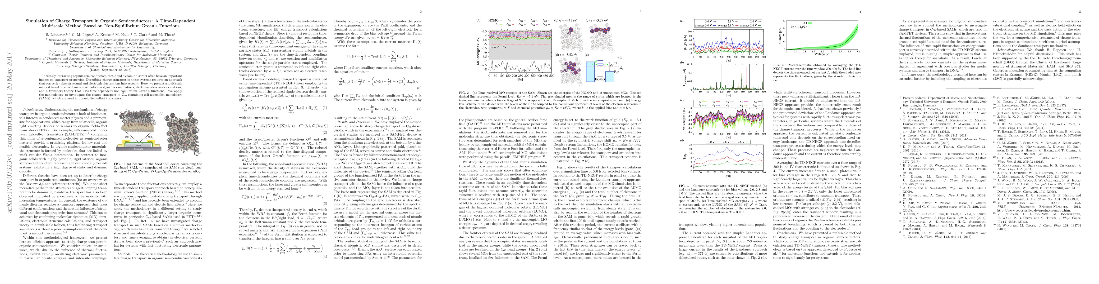 This paper introduces a multiscale simulation method combining molecular dynamics, electronic structure, and time-dependent non-equilibrium Green's functions to study charge transport in organic semiconductors, specifically focusing on C$_{60}$-containing self-assembled monolayers used in organic field-effect transistors. The approach aims to accurately account for structural and electronic fluctuations affecting transport properties.