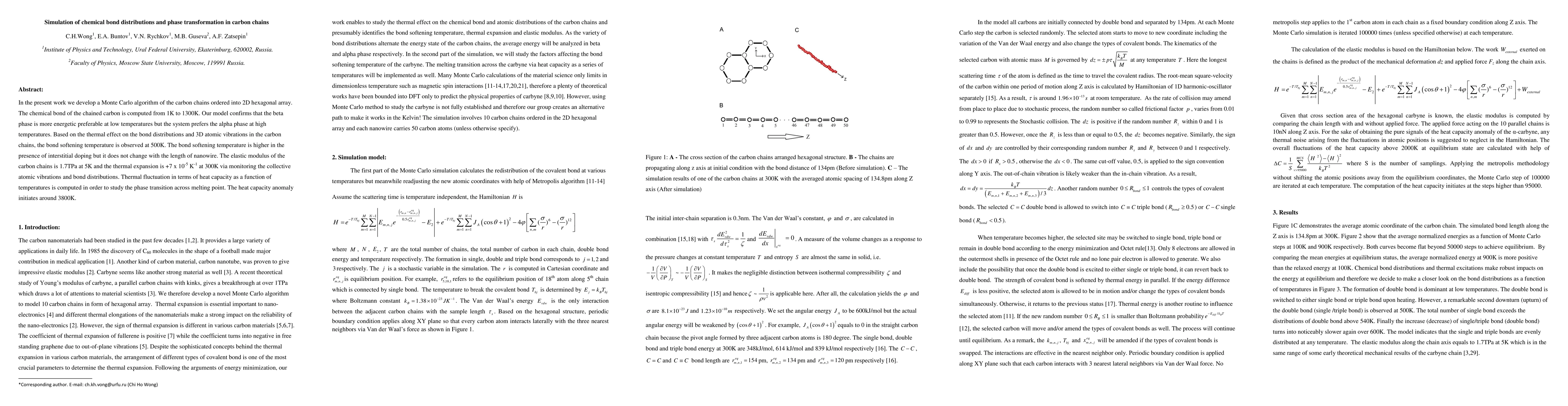 This study employs a Monte Carlo algorithm to simulate carbon chains in a 2D hexagonal array, revealing that the beta phase is favored at low temperatures while the alpha phase dominates at high temperatures. The bond softening temperature is identified at 500K, with interstitial doping raising this temperature but not affecting the nanowire length.