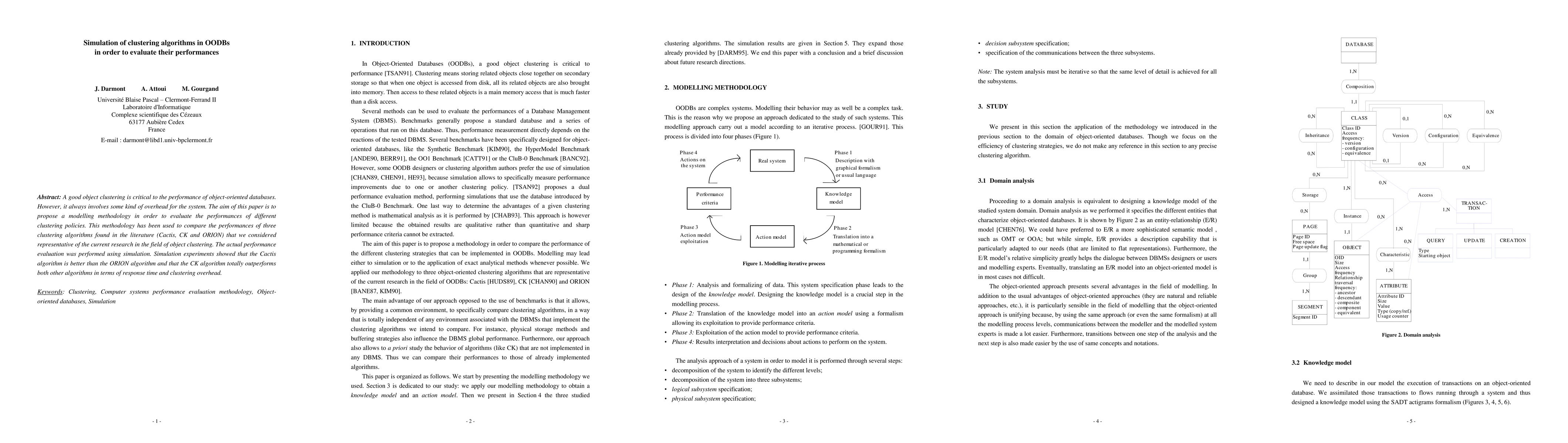 A good object clustering is critical to the performance of object-oriented databases. However, it always involves some kind of overhead for the system. The aim of this paper is to propose a modelling methodology in order to evaluate the performances of different clustering policies. This methodology has been used to compare the performances of three clustering algorithms found in the literature (Cactis, CK and ORION) that we considered representative of the current research in the field of object clustering. The actual performance evaluation was performed using simulation. Simulation experiments showed that the Cactis algorithm is better than the ORION algorithm and that the CK algorithm totally outperforms both other algorithms in terms of response time and clustering overhead.