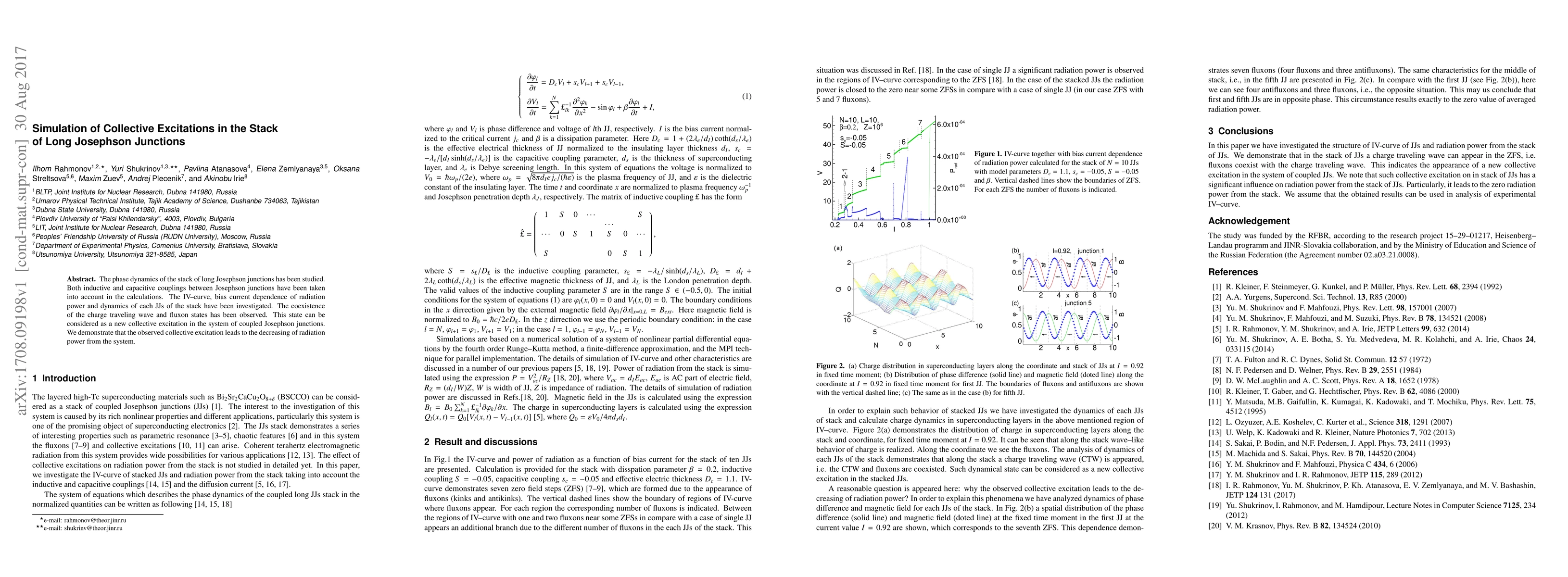 The study investigates the phase dynamics in a stack of long Josephson junctions, considering both inductive and capacitive couplings. It reveals a new collective excitation coexisting with charge traveling waves and fluxons, which decreases the system's radiation power.
