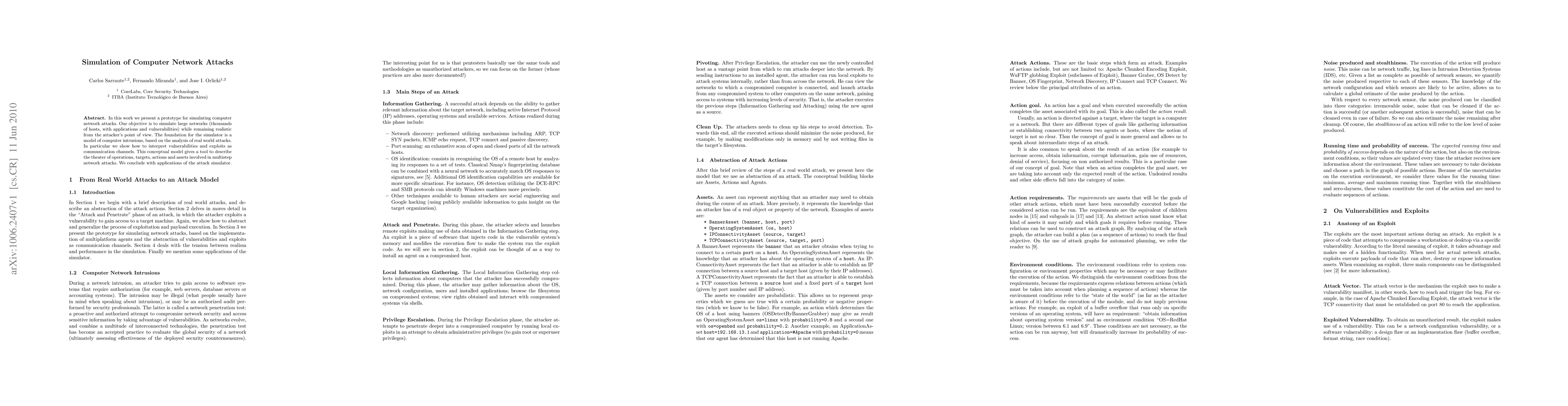 In this work we present a prototype for simulating computer network attacks. Our objective is to simulate large networks (thousands of hosts, with applications and vulnerabilities) while remaining realistic from the attacker's point of view. The foundation for the simulator is a model of computer intrusions, based on the analysis of real world attacks. In particular we show how to interpret vulnerabilities and exploits as communication channels. This conceptual model gives a tool to describe the theater of operations, targets, actions and assets involved in multistep network attacks. We conclude with applications of the attack simulator.