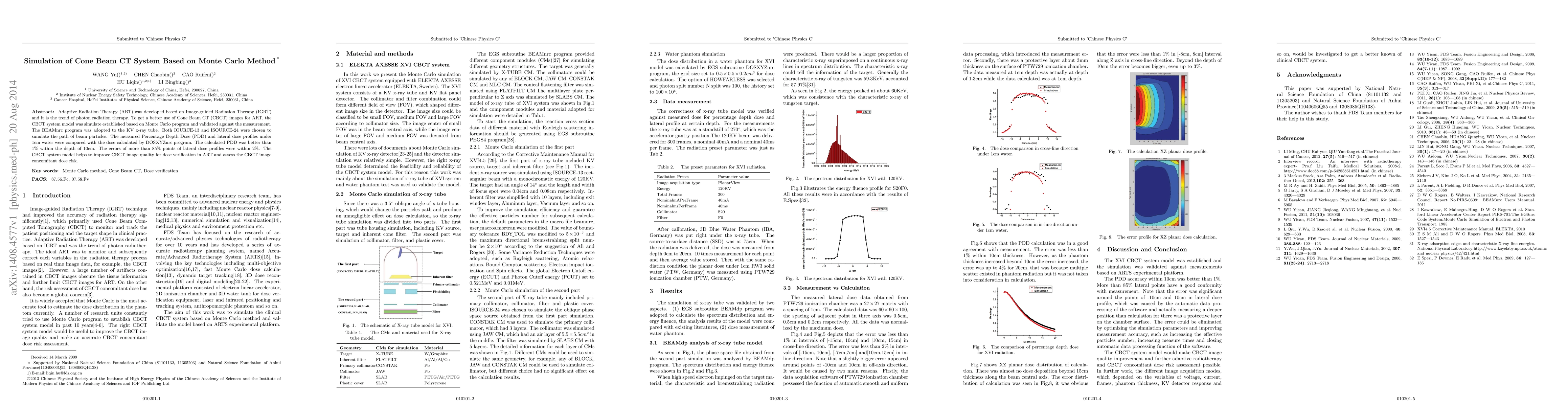 A research paper developed a CBCT system model using Monte Carlo methods to improve dose verification in Adaptive Radiation Therapy, with calculated results showing high accuracy within 1% and 2%.