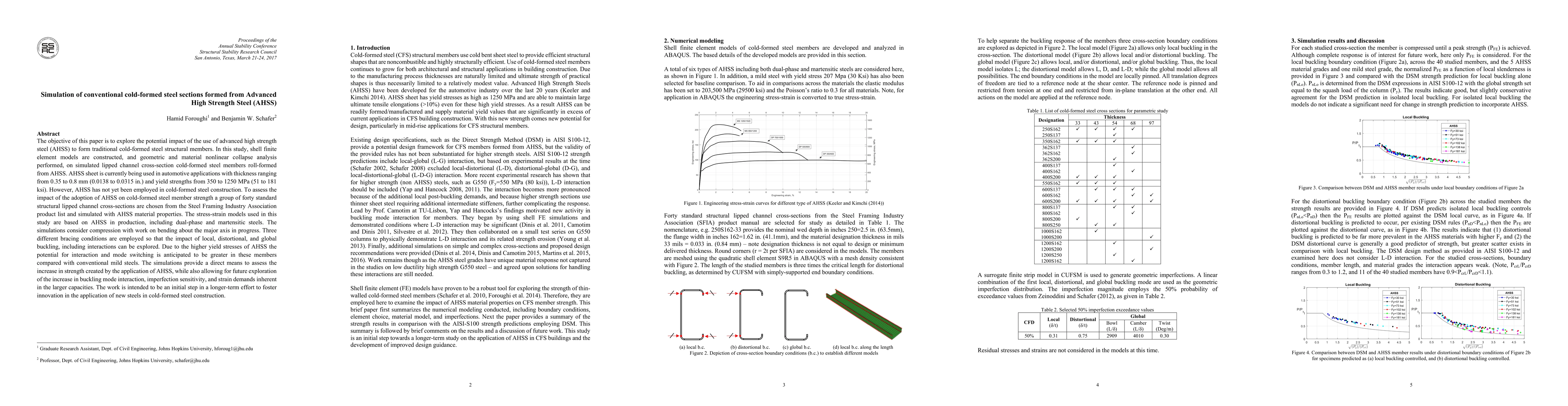 The objective of this paper is to explore the potential impact of the use of advanced high strength steel (AHSS) to form traditional cold-formed steel structural members. In this study, shell finite element models are constructed, and geometric and material nonlinear collapse analysis performed, on simulated lipped channel cross-section cold-formed steel members roll-formed from AHSS. AHSS sheet is currently being used in automotive applications with thickness ranging from 0.35 to 0.8 mm (0.0138 to 0.0315 in.) and yield strengths from 350 to 1250 MPa (51 to 181 ksi). However, AHSS has not yet been employed in cold-formed steel construction. To assess the impact of the adoption of AHSS on cold-formed steel member strength a group of forty standard structural lipped channel cross-sections are chosen from the Steel Framing Industry Association product list and simulated with AHSS material properties. The stress-strain models used in this study are based on AHSS in production, including dual-phase and martensitic steels. The simulations consider compression with work on bending about the major axis in progress. Three different bracing conditions are employed so that the impact of local, distortional, and global buckling, including interactions can be explored. Due to the higher yield stresses of AHSS the potential for interaction and mode switching is anticipated to be greater in these members compared with conventional mild steels. The simulations provide a direct means to assess the increase in strength created by the application of AHSS, while also allowing for future exploration of the increase in buckling mode interaction, imperfection sensitivity, and strain demands inherent in the larger capacities. The work is intended to be an initial step in a longer-term effort to foster innovation in the application of new steels in cold-formed steel construction.