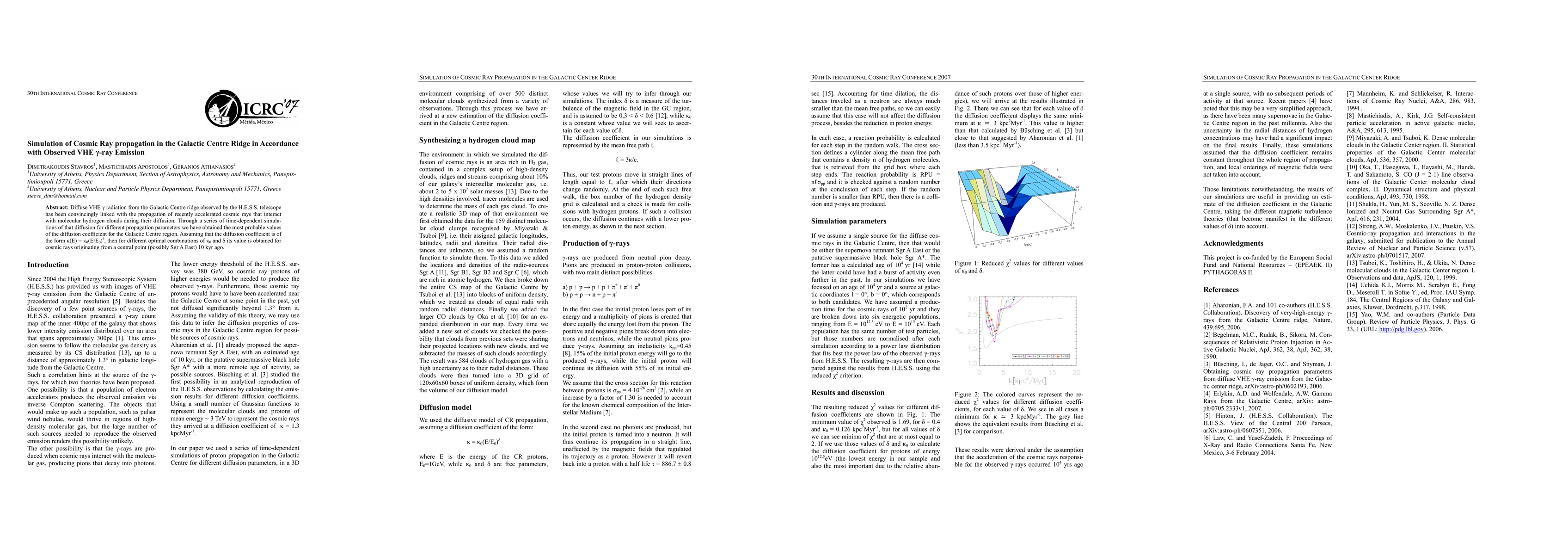 This paper simulates cosmic ray propagation in the Galactic Centre ridge to explain the observed very high-energy (VHE) gamma-ray emission, finding the most probable diffusion coefficient values. The study concludes that the gamma radiation is due to cosmic rays interacting with molecular hydrogen clouds, with optimal parameters suggesting a central source like Sgr A East.