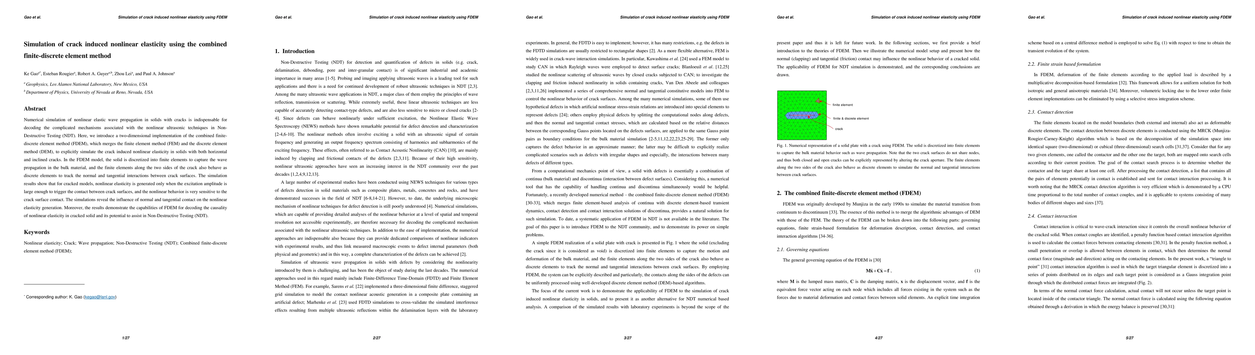 This paper presents a two-dimensional combined finite-discrete element method (FDEM) to simulate crack-induced nonlinear elasticity in solids, showing that nonlinear effects arise only when crack surfaces contact due to high excitation amplitudes. The study highlights the method's potential for aiding in Non-Destructive Testing (NDT) by decoding the mechanisms of nonlinear ultrasonic wave propagation.