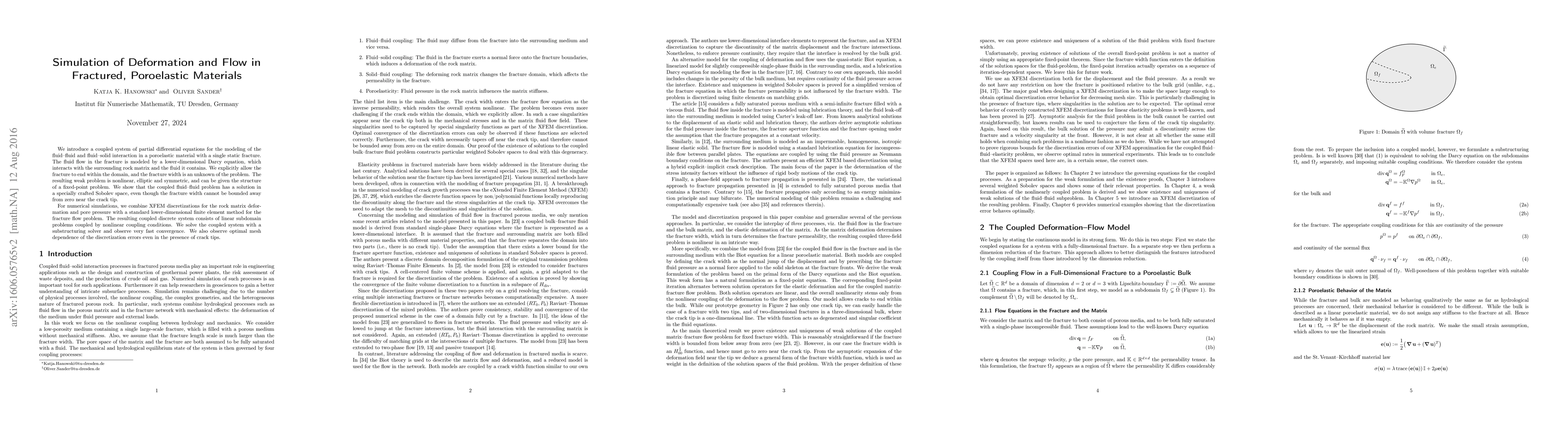 This paper develops a coupled system of PDEs to model fluid-fluid and fluid-solid interactions in fractured, poroelastic materials, employing XFEM and lower-dimensional finite element methods to simulate deformation and flow, achieving fast convergence and optimal mesh dependence.