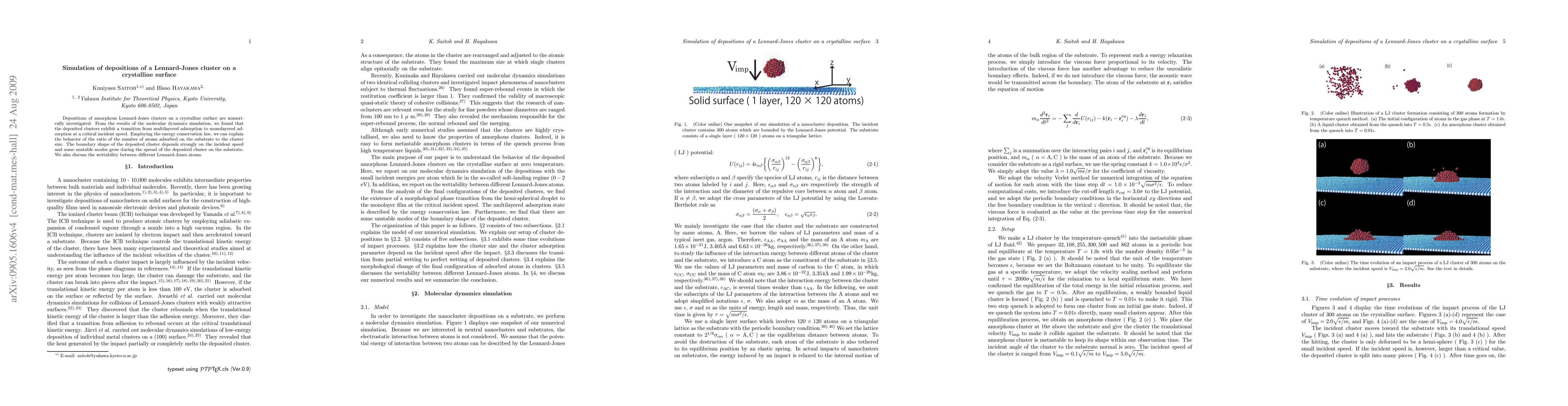 Molecular dynamics simulations were conducted to investigate the deposition of Lennard-Jones clusters on a crystalline surface, analyzing the impact speed's influence on cluster adsorption and morphology.