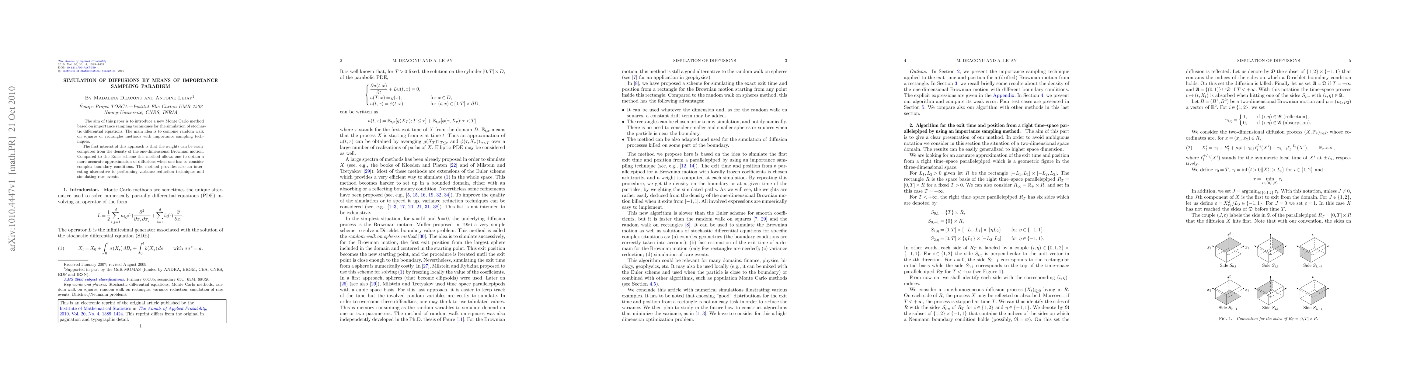 The aim of this paper is to introduce a new Monte Carlo method based on importance sampling techniques for the simulation of stochastic differential equations. The main idea is to combine random walk on squares or rectangles methods with importance sampling techniques. The first interest of this approach is that the weights can be easily computed from the density of the one-dimensional Brownian motion. Compared to the Euler scheme this method allows one to obtain a more accurate approximation of diffusions when one has to consider complex boundary conditions. The method provides also an interesting alternative to performing variance reduction techniques and simulating rare events.