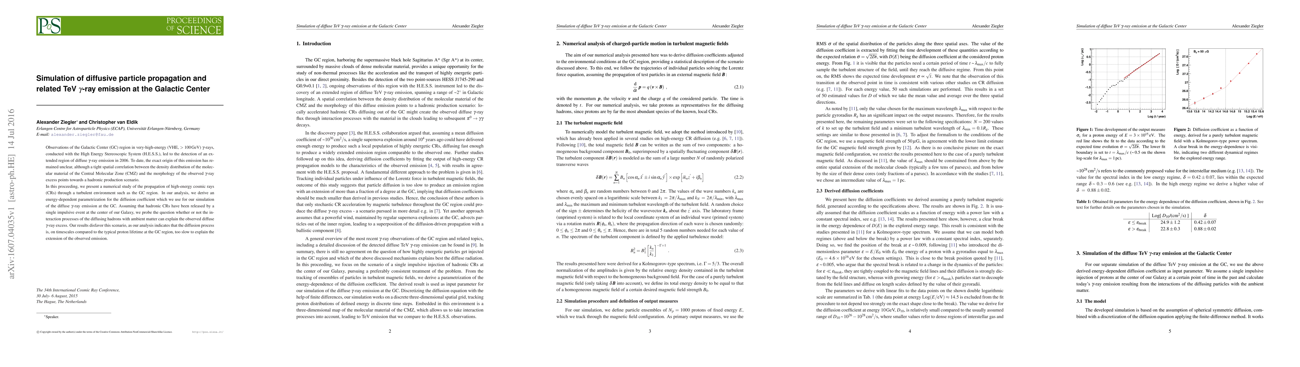 Observations of the Galactic Center (GC) region in very-high-energy (VHE, >100 GeV) gamma rays, conducted with the High Energy Stereoscopic System (H.E.S.S.), led to the detection of an extended region of diffuse gamma-ray emission in 2006. To date, the exact origin of this emission has remained unclear, although a tight spatial correlation between the density distribution of the molecular material of the Central Molecular Zone (CMZ) and the morphology of the observed gamma-ray excess points towards a hadronic production scenario. In this proceeding, we present a numerical study of the propagation of high-energy cosmic rays (CRs) through a turbulent environment such as the GC region. In our analysis, we derive an energy-dependent parametrization for the diffusion coefficient which we use for our simulation of the diffuse gamma-ray emission at the GC. Assuming that hadronic CRs have been released by a single impulsive event at the center of our Galaxy, we probe the question whether or not the interaction processes of the diffusing hadrons with ambient matter can explain the observed diffuse gamma-ray excess. Our results disfavor this scenario, as our analysis indicates that the diffusion process is, on timescales compared to the typical proton lifetime at the GC region, too slow to explain the extension of the observed emission.