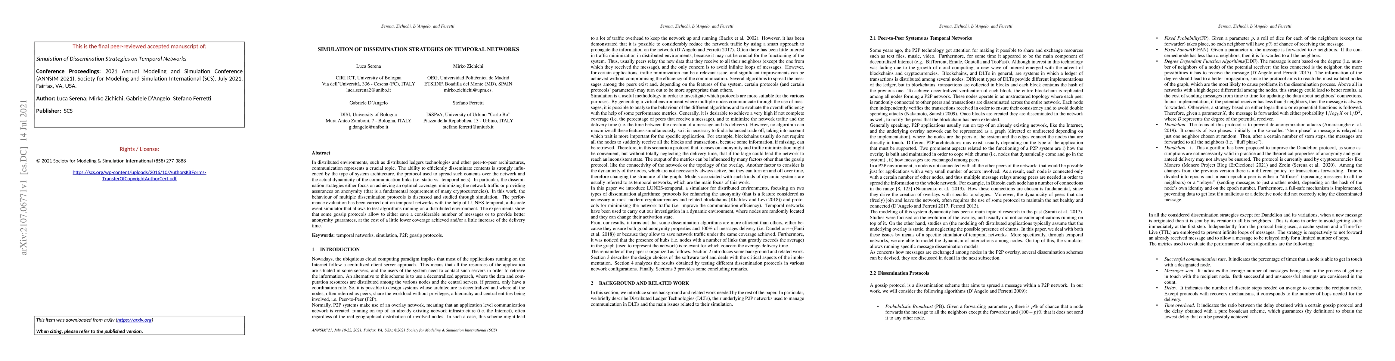 In distributed environments, such as distributed ledgers technologies and other peer-to-peer architectures, communication represents a crucial topic. The ability to efficiently disseminate contents is strongly influenced by the type of system architecture, the protocol used to spread such contents over the network and the actual dynamicity of the communication links (i.e. static vs. temporal nets). In particular, the dissemination strategies either focus on achieving an optimal coverage, minimizing the network traffic or providing assurances on anonymity (that is a fundamental requirement of many cryptocurrencies). In this work, the behaviour of multiple dissemination protocols is discussed and studied through simulation. The performance evaluation has been carried out on temporal networks with the help of LUNES-temporal, a discrete event simulator that allows to test algorithms running on a distributed environment. The experiments show that some gossip protocols allow to either save a considerable number of messages or to provide better anonymity guarantees, at the cost of a little lower coverage achieved and/or a little increase of the delivery time.