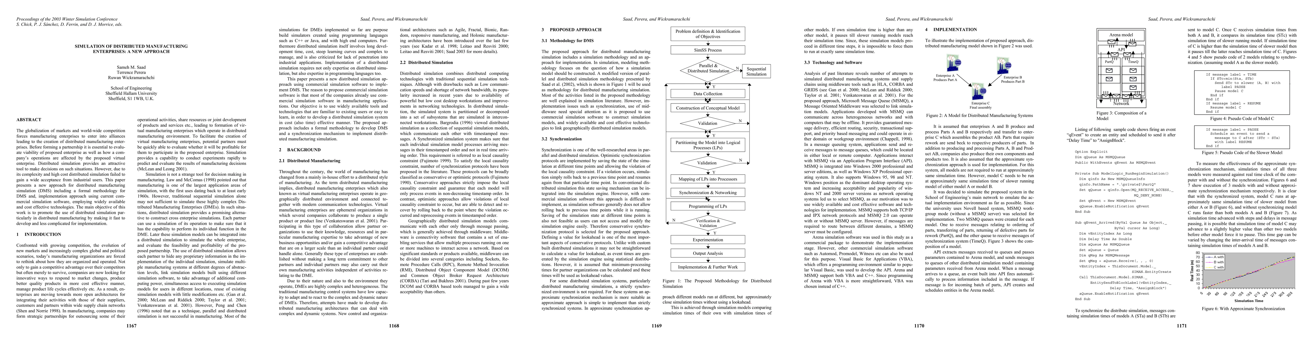 The globalization of markets and world-wide competition forces manufacturing enterprises to enter into alliances leading to the creation of distributed manufacturing enterprises. Before forming a partnership it is essential to evaluate viability of proposed enterprise as well as how a companys operations are affected by the proposed virtual enterprise. Distributed simulation provides an attractive tool to make decisions on such situations. However, due to its complexity and high cost distributed simulation failed to gain a wide acceptance from industrial users. This paper presents a new approach for distributed manufacturing simulation (DMS) including a formal methodology for DMS and, implementation approach using current commercial simulation software, employing widely available and cost effective technologies. The main objective of this work is to promote the use of distributed simulation particularly in distributed manufacturing by making it fast to develop and less complicated for implementation.