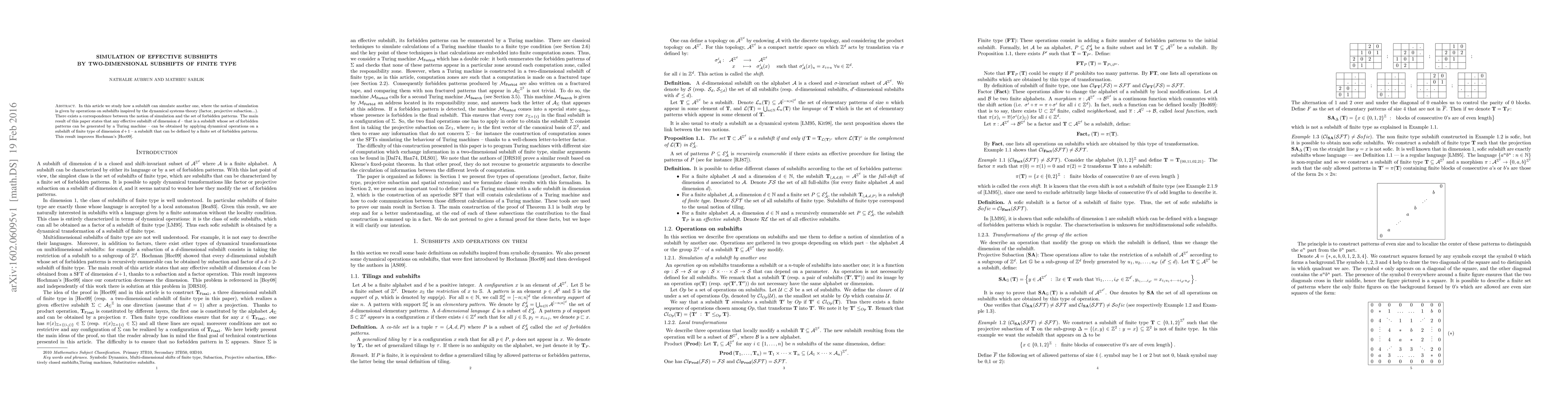 This paper explores the simulation of effective subshifts using higher-dimensional subshifts of finite type, demonstrating that any effective subshift can be derived from a subshift of finite type via dynamical operations. The result enhances previous findings by showing a correspondence between simulation and forbidden patterns.