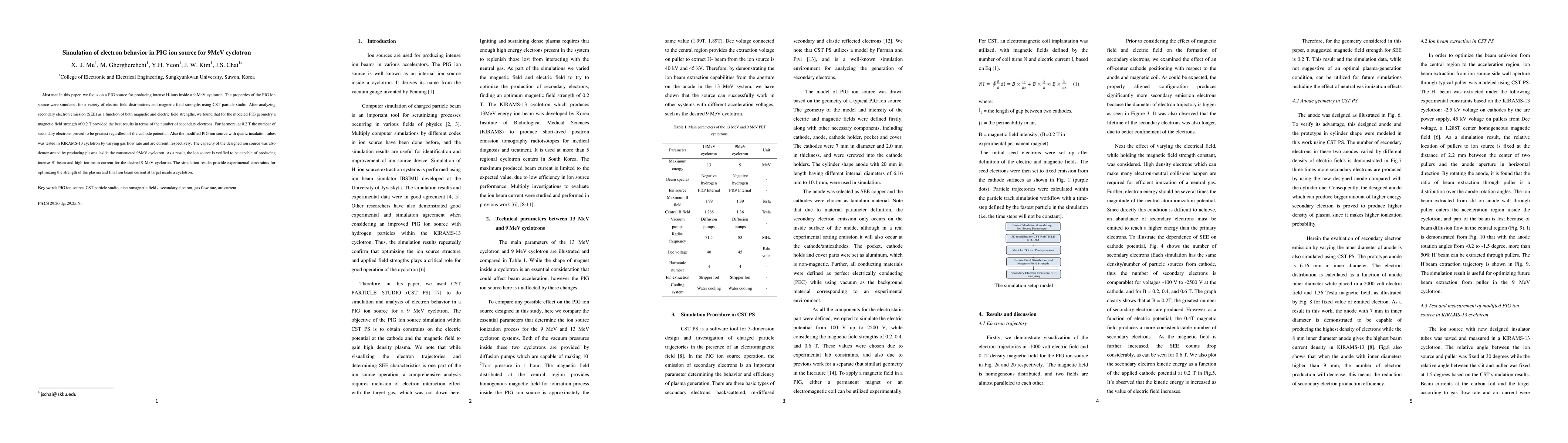 This paper simulates electron behavior in a PIG ion source for a 9 MeV cyclotron, finding that a magnetic field strength of 0.2 T maximizes secondary electron emission, regardless of cathode potential. The modified PIG ion source was tested in a cyclotron, successfully producing intense H- beams and high ion beam current.