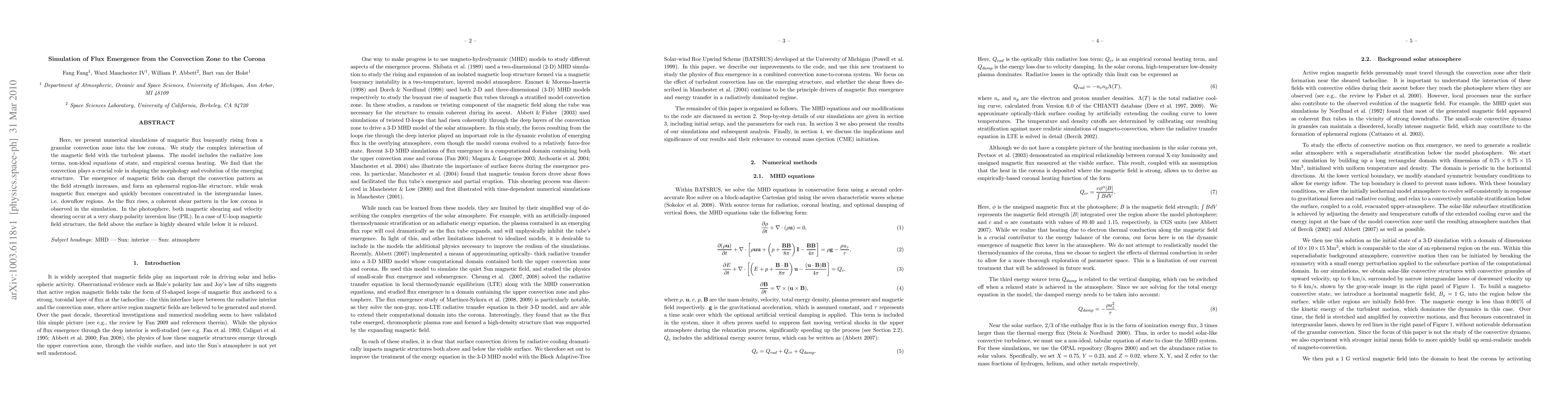 This paper simulates the emergence of magnetic flux from the convection zone into the corona, revealing the complex interaction of magnetic fields with turbulent plasma. The study highlights the crucial role of convection in shaping the emerging magnetic structures, which can disrupt convection patterns and form ephemeral regions as the field strength increases.