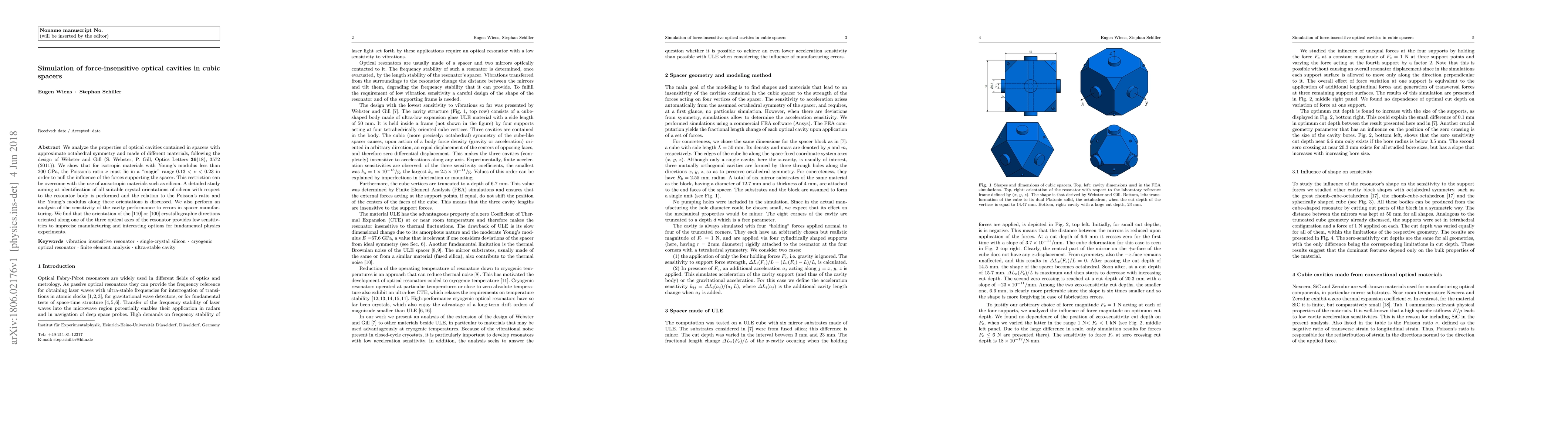 We analyze the properties of optical cavities contained in spacers with approximate octahedral symmetry and made of different materials,following the design of Webster and Gill (S. Webster, P. Gill, Optics Letters 36(18), 3572 (2011)). We show that for isotropic materials with Young's modulus less than 200 GPa, the Poisson's ratio $\nu$ must lie in a "magic" range 0.13<$\nu$<0.23 in order to null the influence of the forces supporting the spacer. This restriction can be overcome with the use of anisotropic materials such as silicon. A detailed study aiming at identification of all suitable crystal orientations of silicon with respect to the resonator body is performed and the relation to the Poisson's ratio and the Young's modulus along these orientations is discussed. We also perform an analysis of the sensitivity of the cavity performance to errors in spacer manufacturing. We find that the orientation of the [110] or [100] crystallographic directions oriented along one of the three optical axes of the resonator provides low sensitivities to imprecise manufacturing and interesting options for fundamental physics experiments.